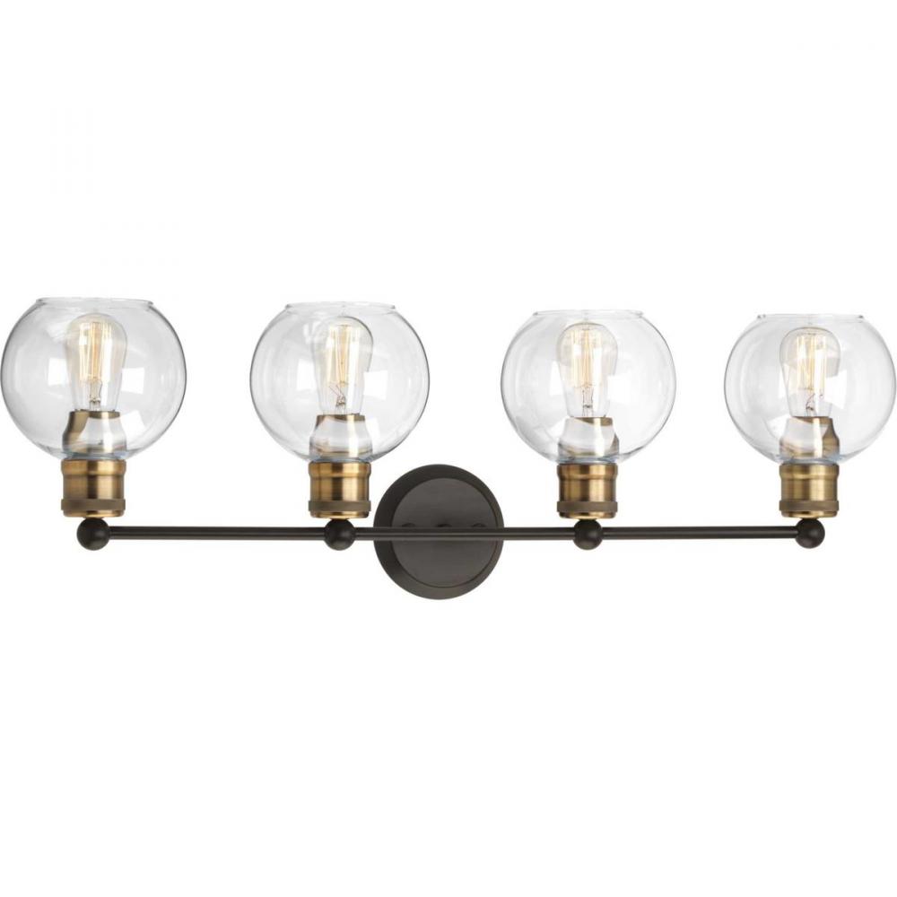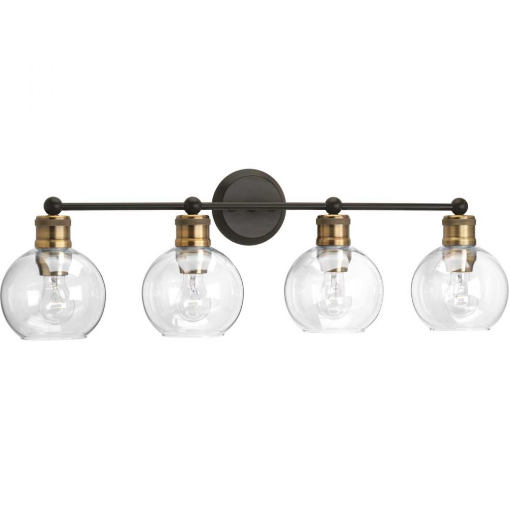 The Hansford collection of fixtures feature a clear, spherical shade paired with vintage style metal fittings in an Antique Bronze and Vintage Brass combination finish. Featuring a clean and precise design with generous scale, Hansford's classic style brings tranquility to your home with. Hansford lends itself to Farmhouse, Coastal or Industrial interiors. Can be used with clear or vintage bulbs for a variety of looks. The four-light bath & vanity fixture can be mounted up or down.