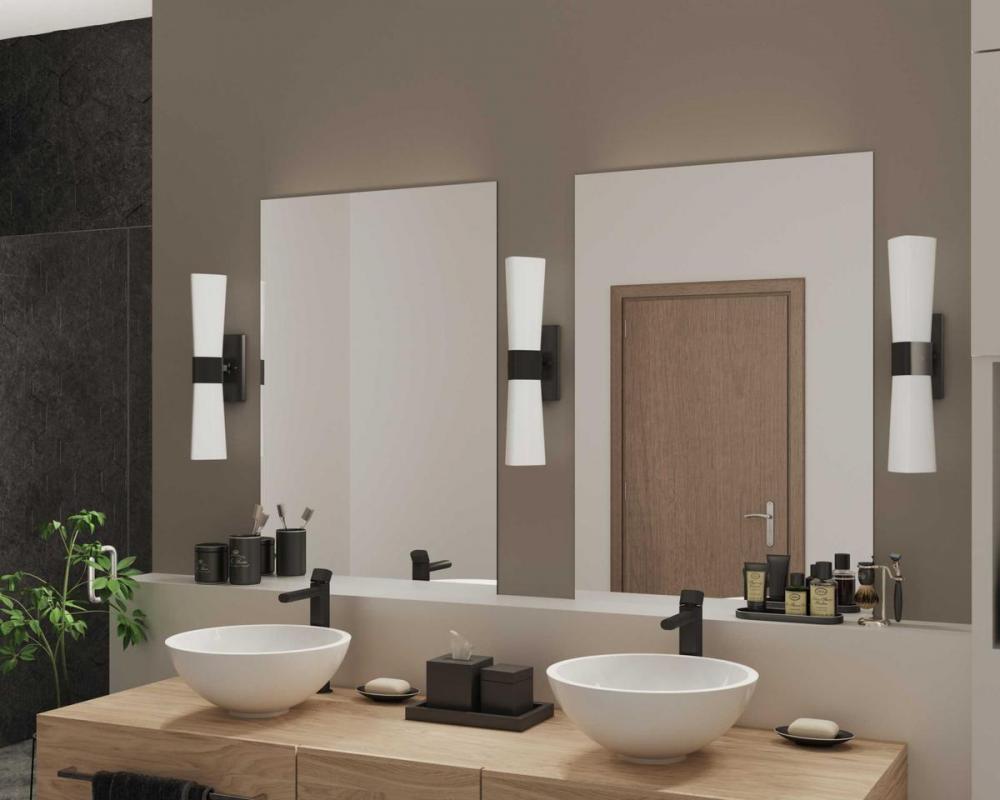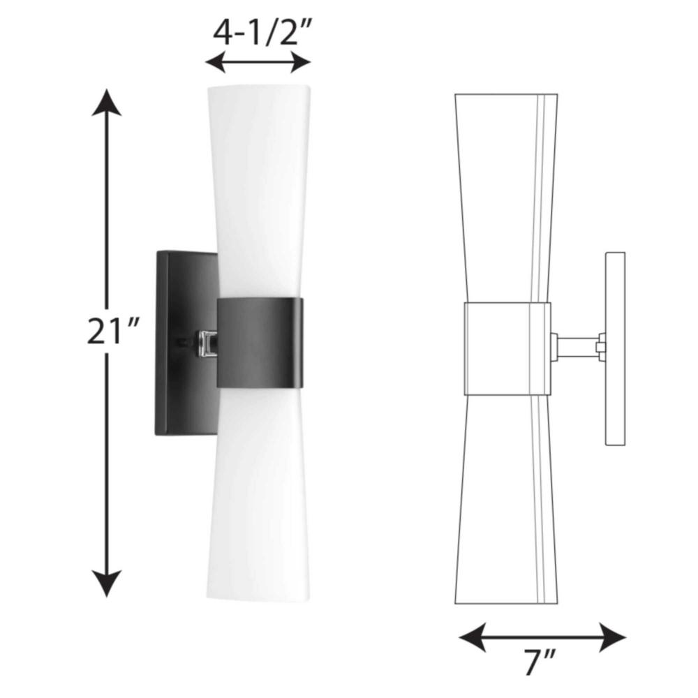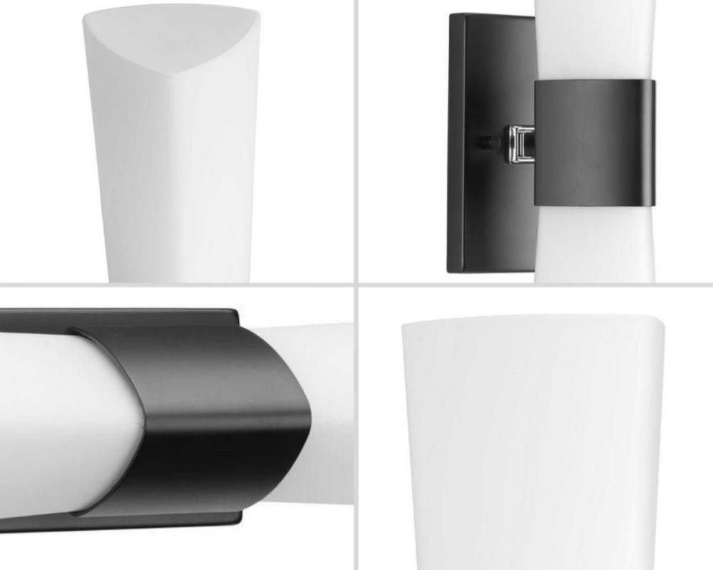 Ideal for a bathroom;Perfect for modern and transitional style settings;Classic matte black finish;Elegant etched opal glass shades;Fixture can mount horizontal and vertical;Use 2 medium base bulbs that are sold separately (100 W max - LED/CFL/incandescent
