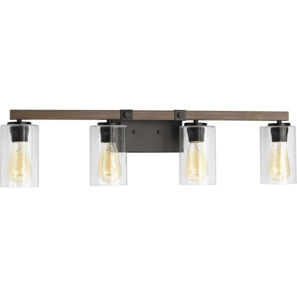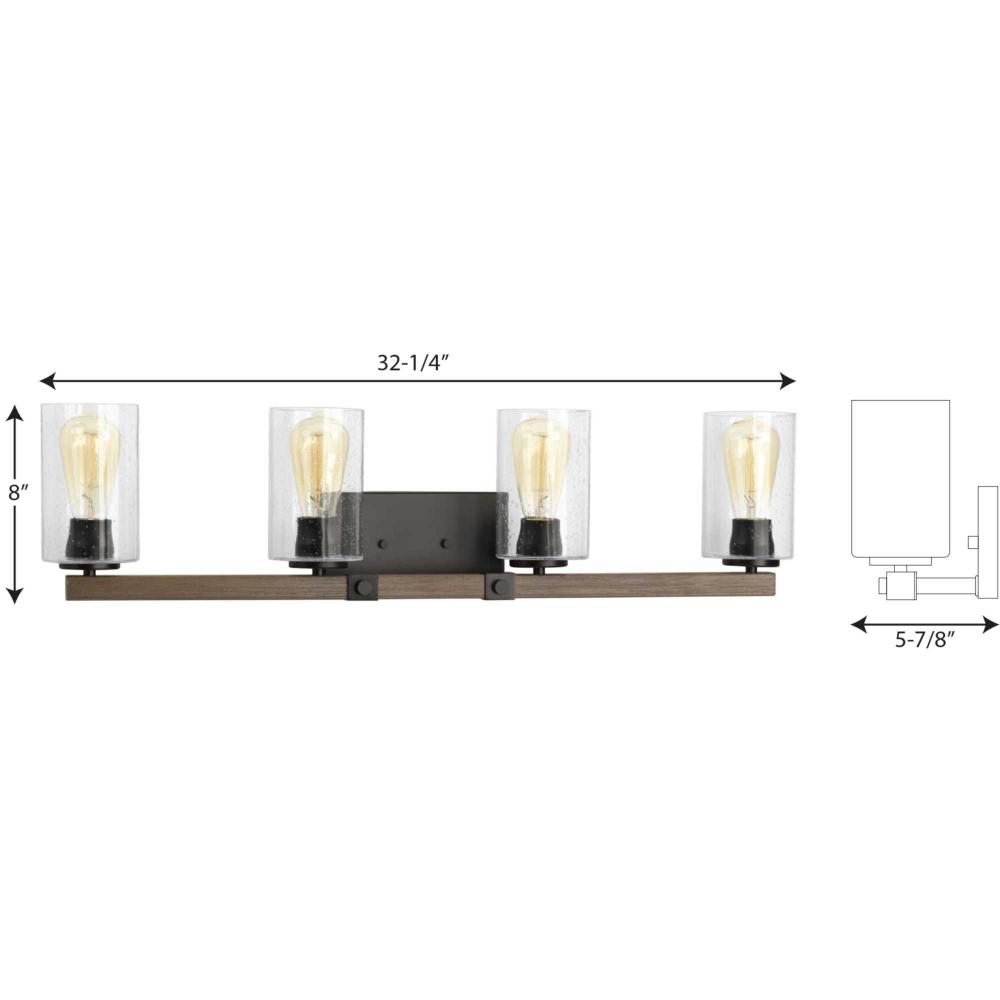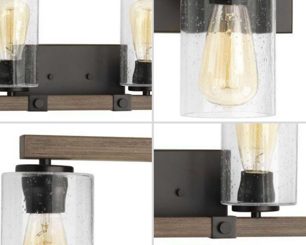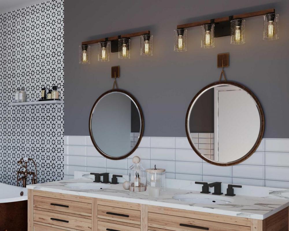 Ideal for a bathroom;Perfect for farmhouse, rustic, and urban industrial style settings;Handsome antique bronze finish with faux-painted wooden plank;Rustic clear seeded glass shades;Mount the light fixture facing up or down;Use 4 medium base bulbs that ar