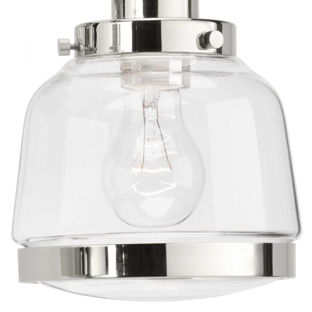 Ideal for a bathroom, dining room, hallway, or foyer;Perfect for farmhouse and vintage electric style settings;Subtle polished nickel finish;Crisp clear glass shade;Mount the light fixture facing up or down;Use 1 medium base bulb that is sold separately (7