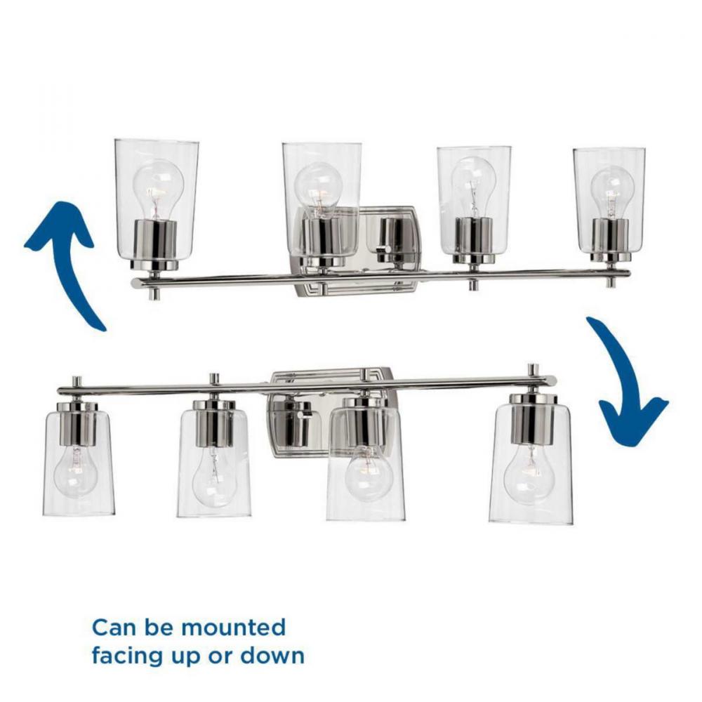 Ideal for a bathroom;Perfect for new traditional, traditional, and transitional style settings;Subtle polished nickel finish;Crisp clear glass shades;Mount the light fixture facing up or down;Use 4 medium base bulbs that are sold separately (60 W max - LED