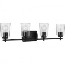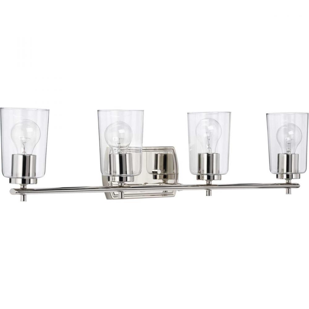 For the ultimate ambient lighting experience for bathroom or vanity setting that seeks illumination, look no further than the Adley four-light bath. A Polished Nickel, curved backplate and simple, straight bar hold classic, clear glass shades, making it an excellent choice for new traditional and transitional settings.