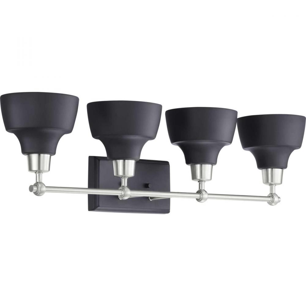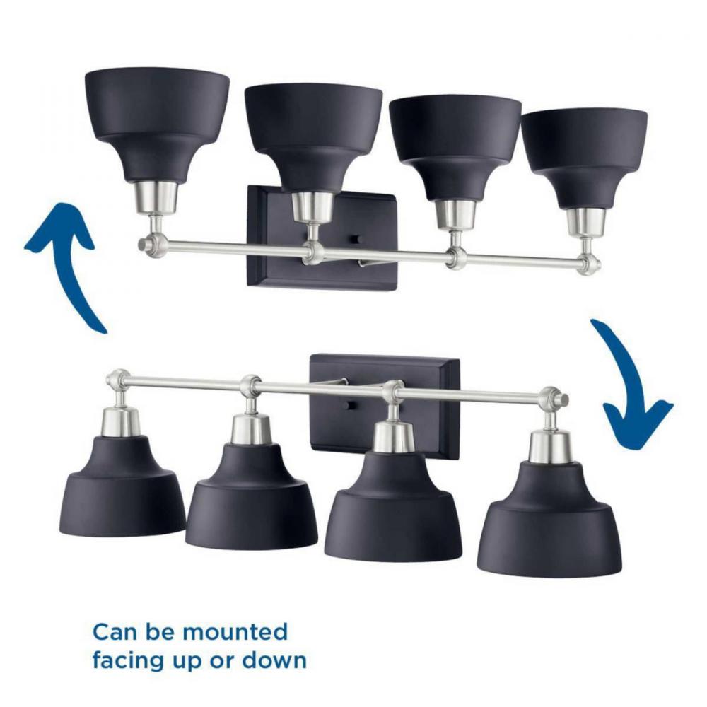 Ideal for a bathroom;Perfect for coastal, farmhouse, and urban industrial style settings;Graphite finish with beautiful brushed nickel accents;Metal reflector-style shades;Mount the light fixture facing up or down;Use 4 medium base bulbs that are sold sepa
