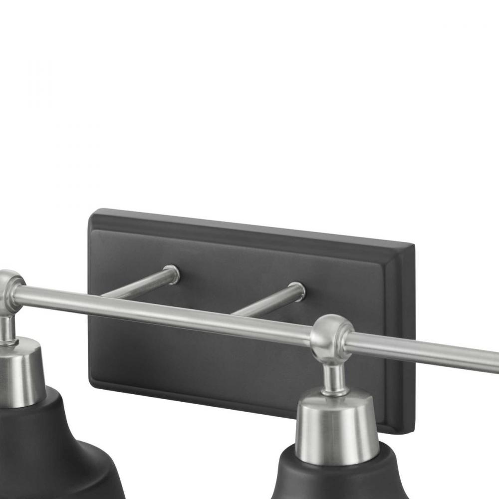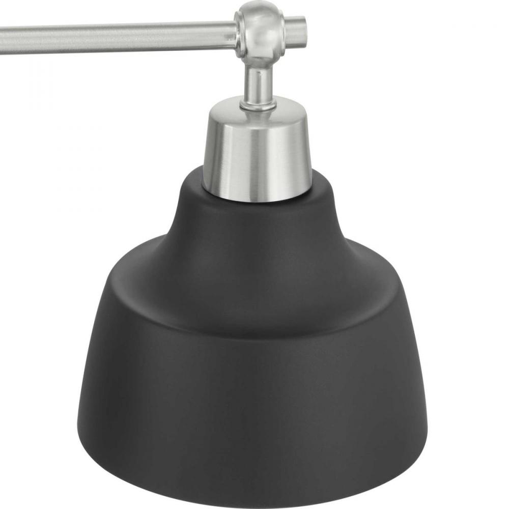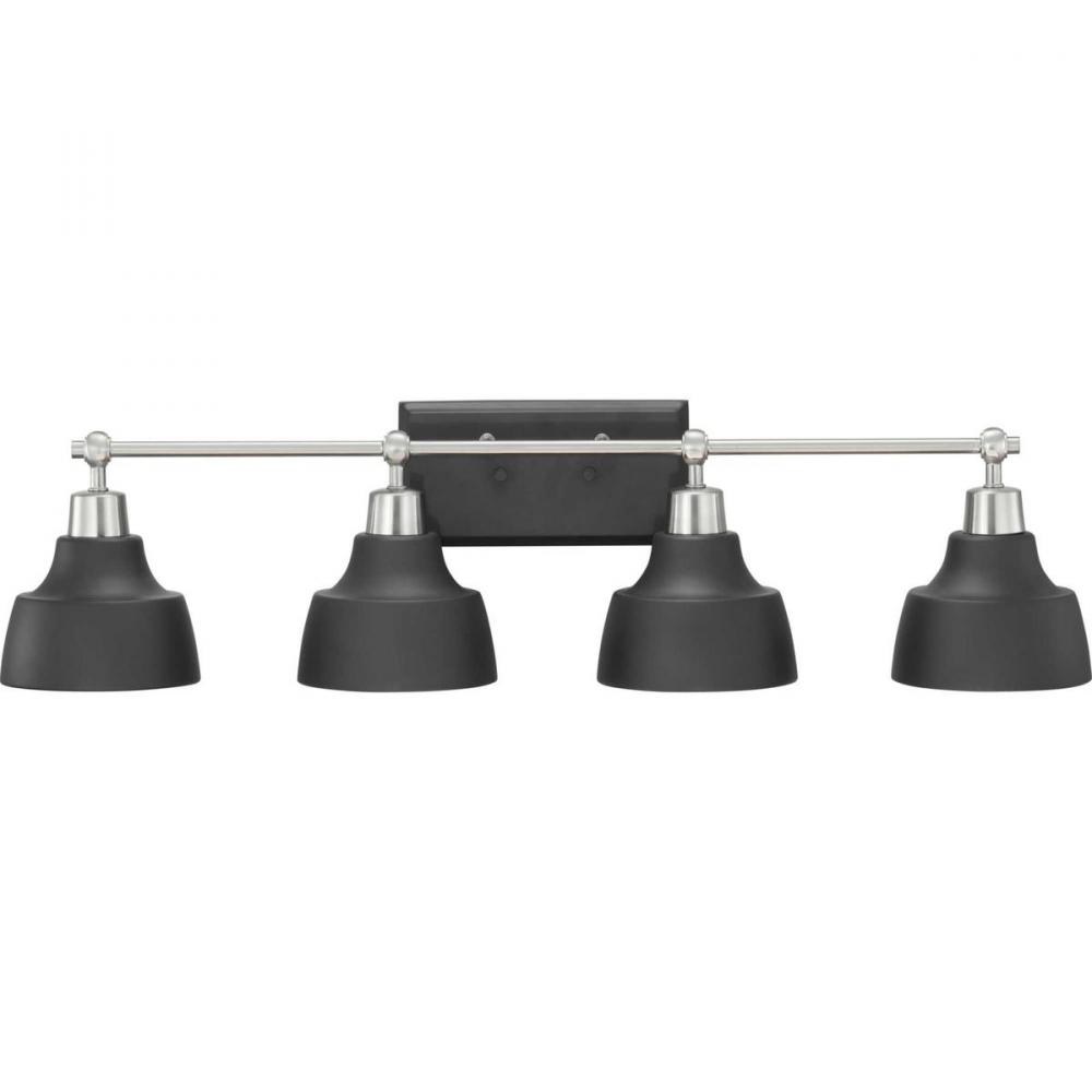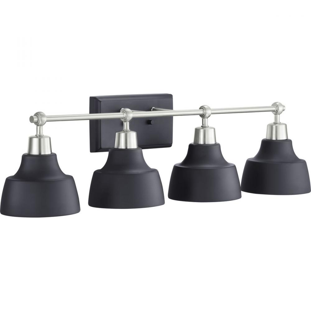 Vintage and industrial styling coalesce in the functional, yet elegant frame of the Bramlett Collection four-light bath & vanity. Graphite Metal reflector style shades are complemented by contrasting metallic fittings in Brushed Nickel.