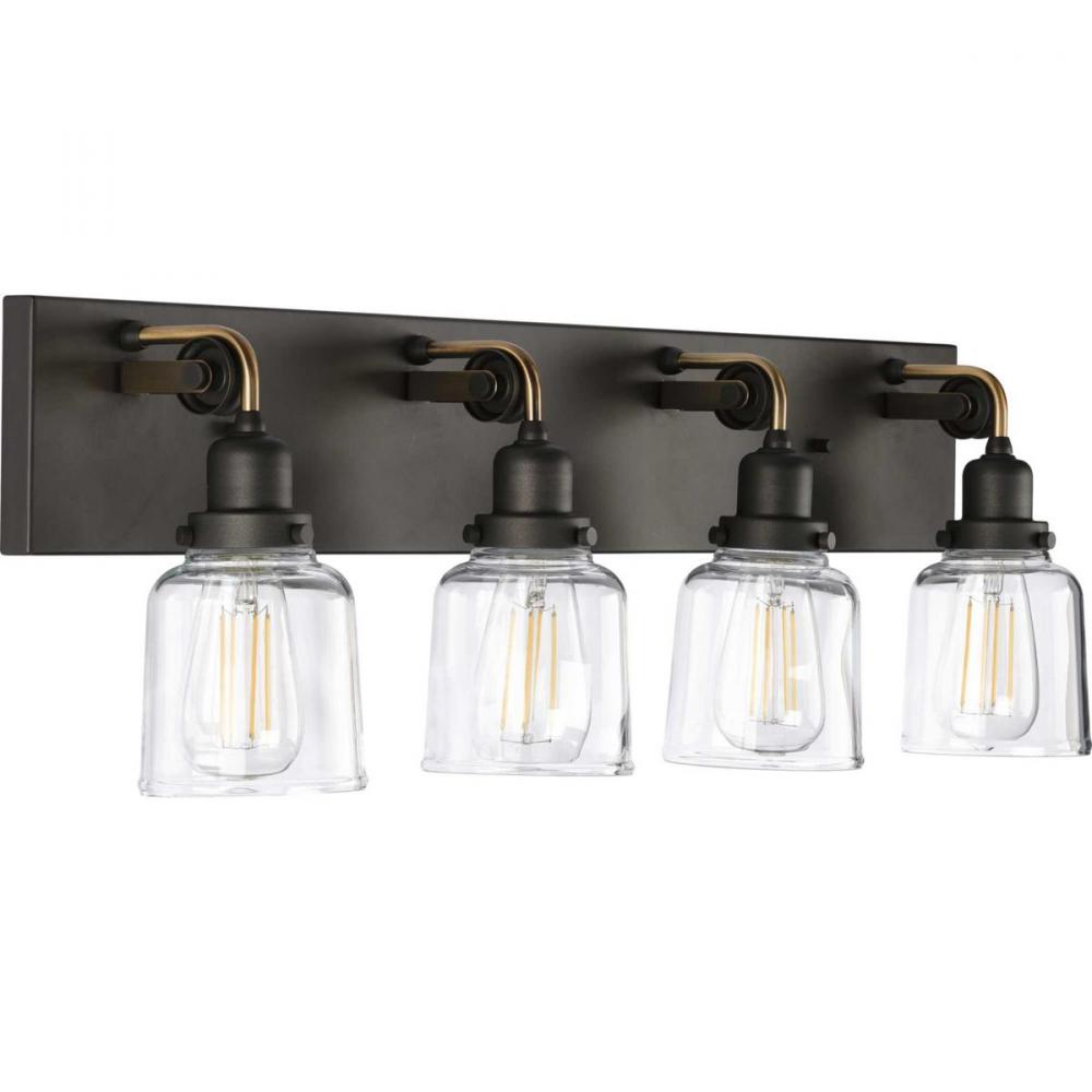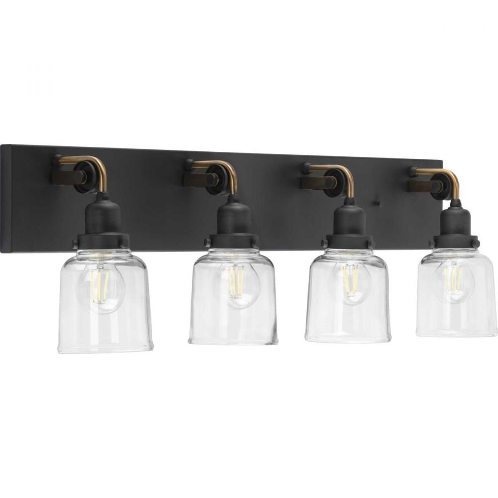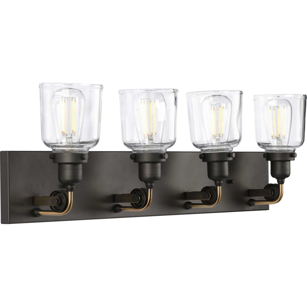 Ideal for a bathroom;Perfect for farmhouse and urban industrial style settings;Gorgeous graphite finish with antique brass accents;Crisp clear glass shades;Mount the light fixture facing up or down;Use 4 medium base bulbs that are sold separately (60 W max