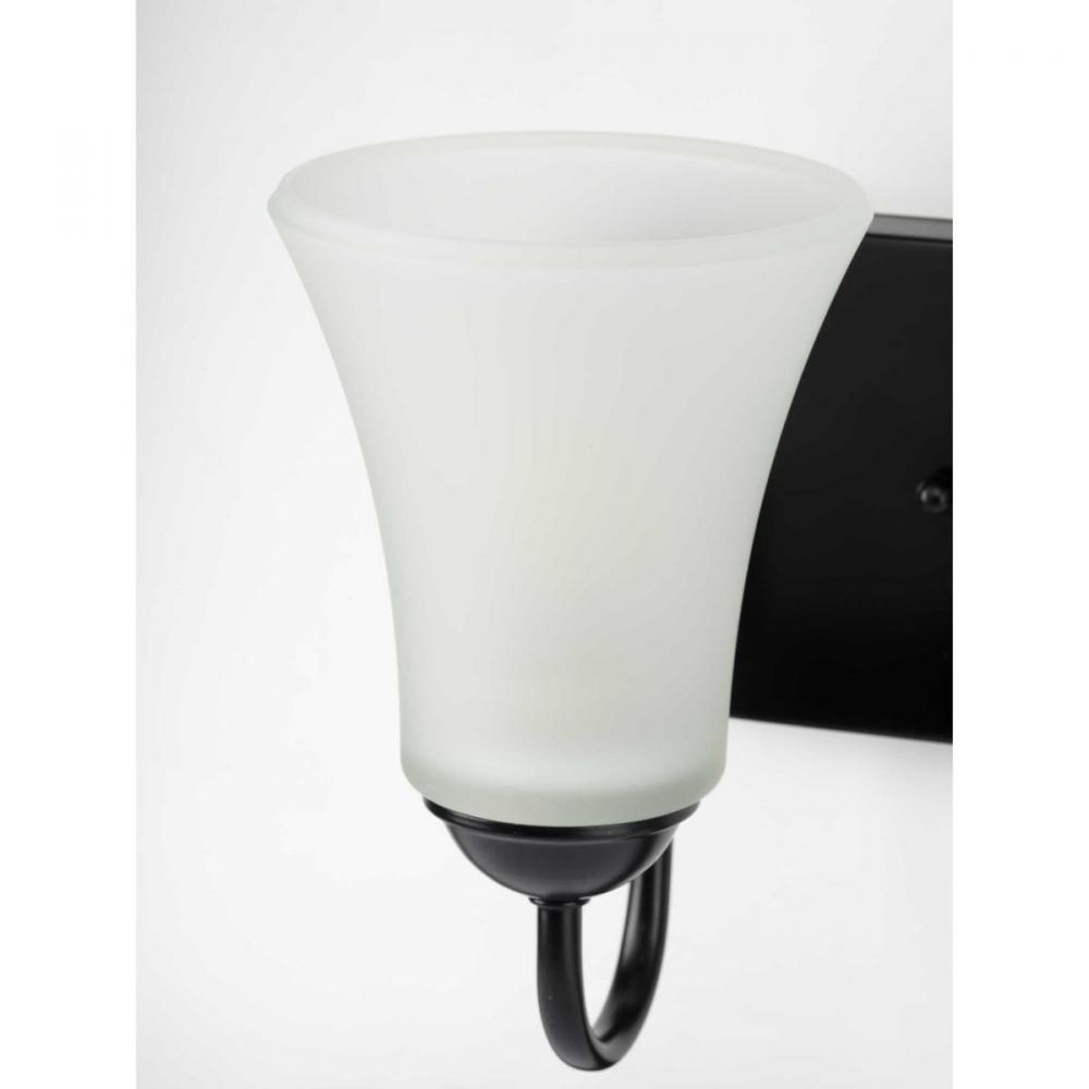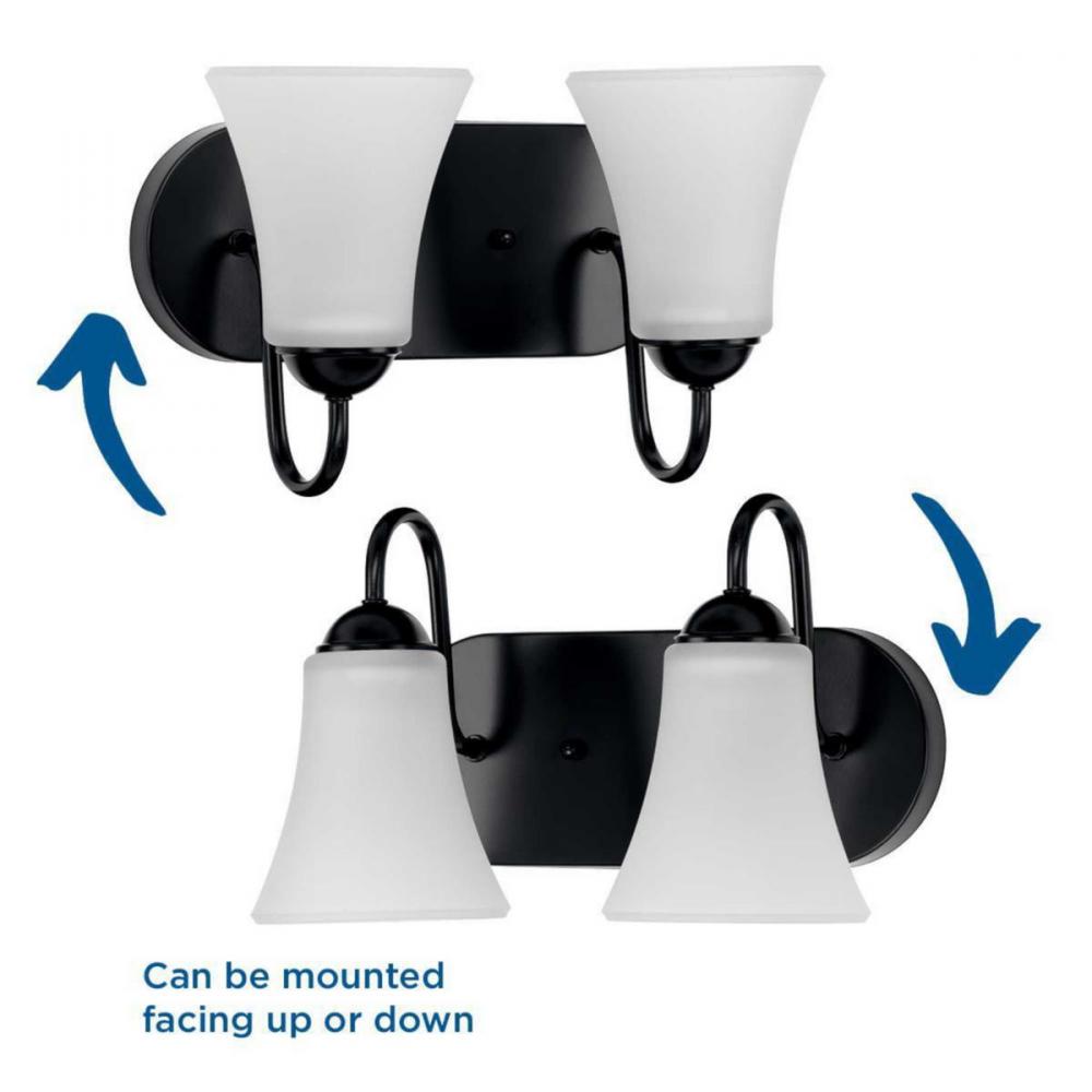 Ideal for a bathroom and powder room.;Perfect for traditional and transitional style settings;Classic matte black finish;Elegant etched glass shades;Mount the light fixture facing up or down;Use 2 medium base bulbs that are sold separately (100 W max - LED