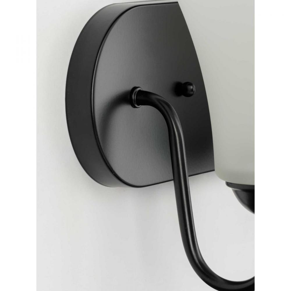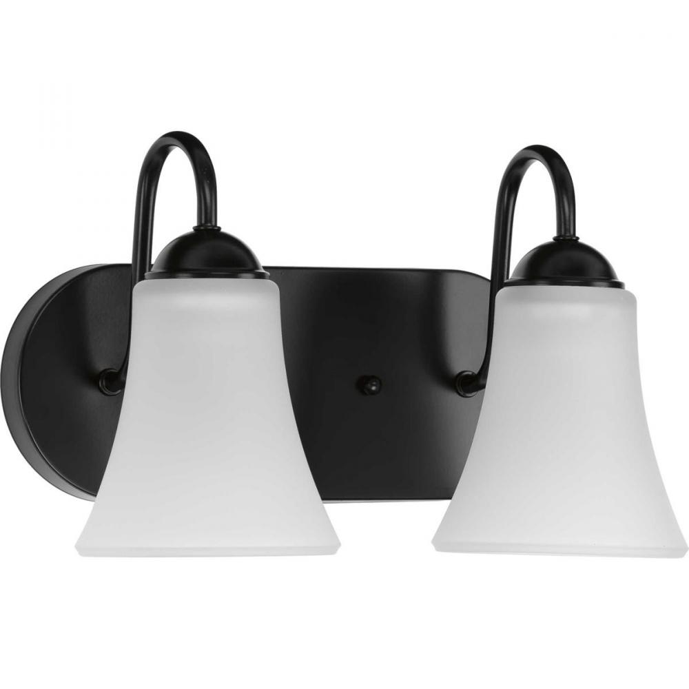 Make a room-defining statement with the Classic two-light bath in any transitional interior. Bell-shaped, etched glass shades contract against a bold, Black curved backplate. Delicate curved arms extend to hold the elegant light sources as they offer warm task lighting on either side of a bathroom mirror, in a dining room, or wherever focused task lighting is called upon.