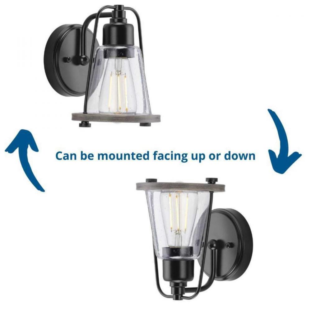 Mix old and new for charming character with the Conway Collection 1-Light Matte Black Clear Seeded Farmhouse Bath Vanity Light. A matte black bell-shaped frame and round backplate are accented by hand-painted, weathered grey wood-style accents for a charming nautical aesthetic. A light source glows from within a clear seeded glass shade for visual texture.