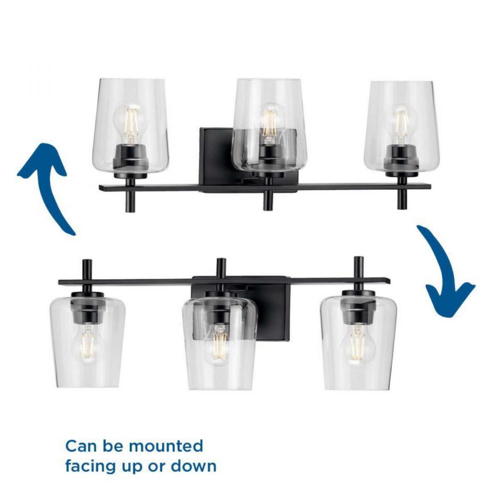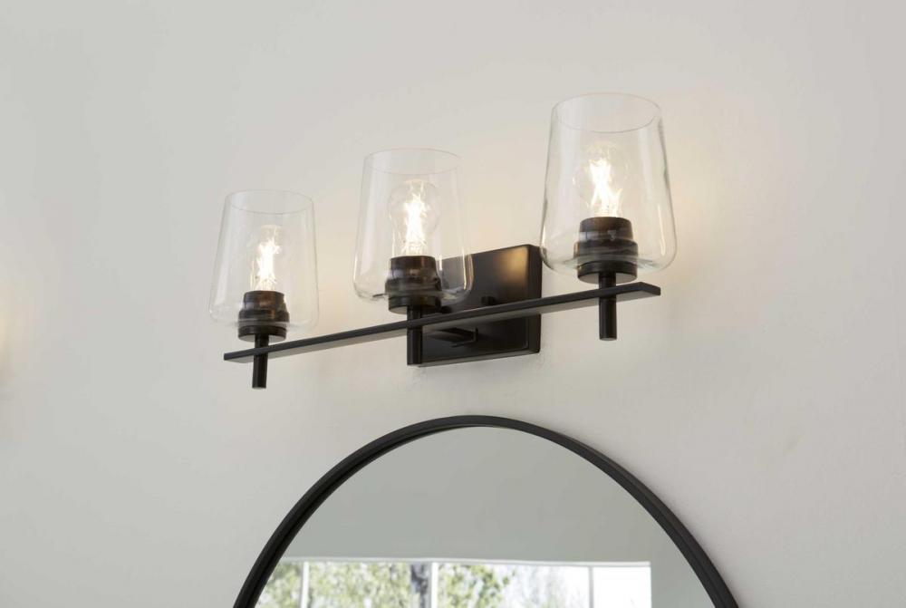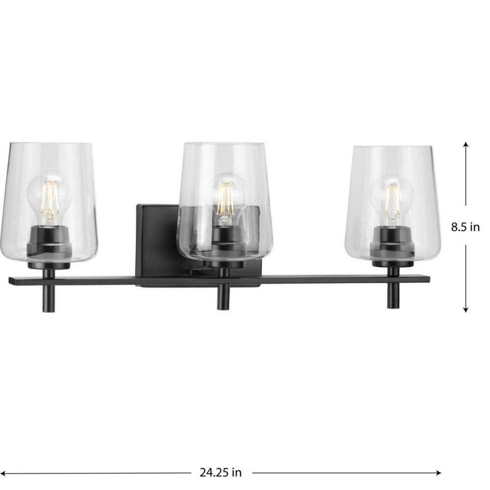Ideal for a bathroom;Perfect for new traditional style settings;Classic matte black finish;Crisp clear glass shades;Use 3 medium base bulbs that are sold separately (60w max - LED/CFL/incandescent), compatible with dimmable bulbs;Measures 8-1/2-inch height