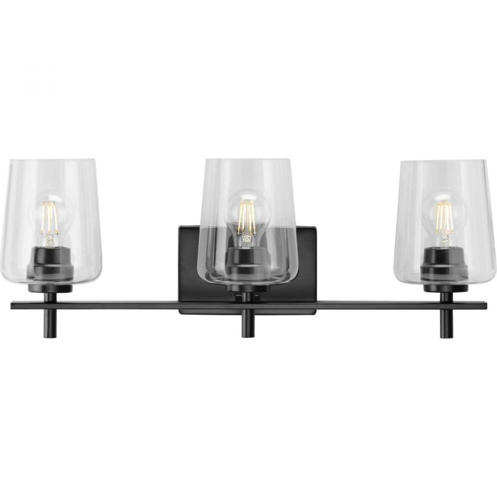 Create an enduring silhouette ornamented by timeless details with a bath vanity light from the Calais Collection. The elegantly simple frame is coated in a classic matte black finish. Clear glass shades provide a contemporary take on the traditional design. Compatible with dimmable bulbs.