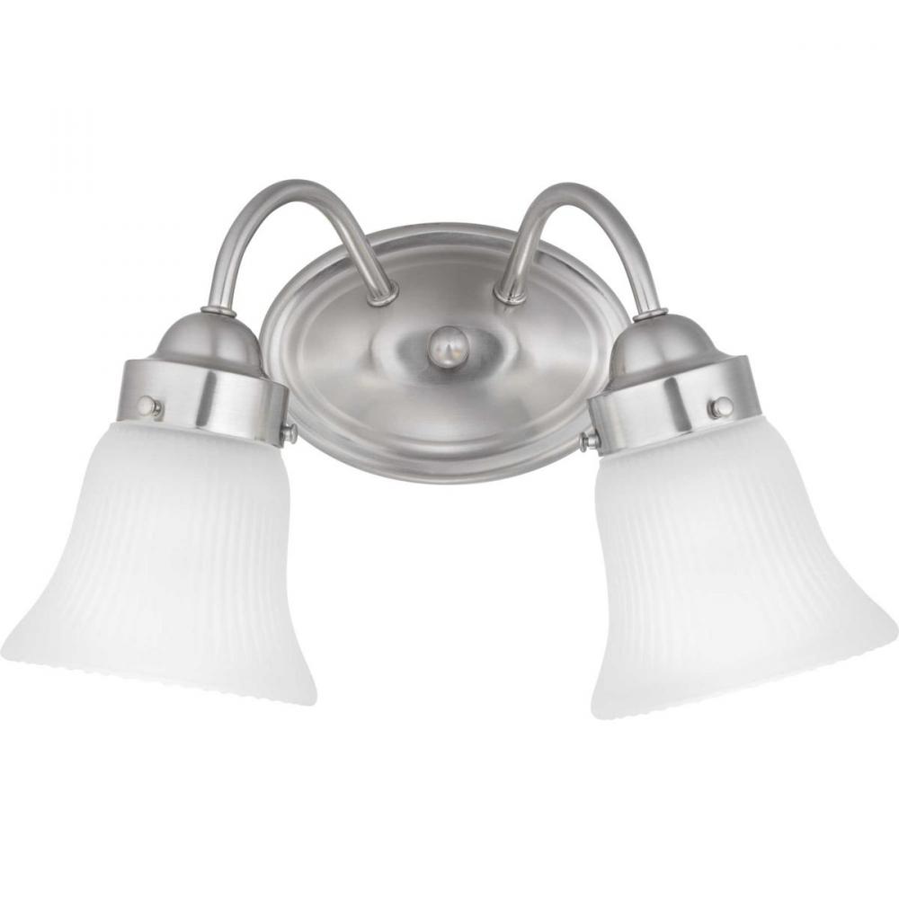 Ideal for a bathroom and powder room.;Perfect for traditional style settings;Beautiful brushed nickel finish;Elegant etched fluted glass shades;Mount the light fixture facing up or down;Use 2 medium base bulbs that are sold separately (100 W max - LED/CFL/
