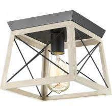 Create a cozy home with the Briarwood Collection 1-Light Bleached Oak Farmhouse Flush Mount Ceiling Light. A light source exudes a comforting country glow as it peeks through the X-brace design reminiscent of country barn doors and rustic farmhouse gates. A faux-wood frame coated in a rustic bleached oak finish accented by a galvanized plate on top of the structure infuses the ceiling light with charming country character.