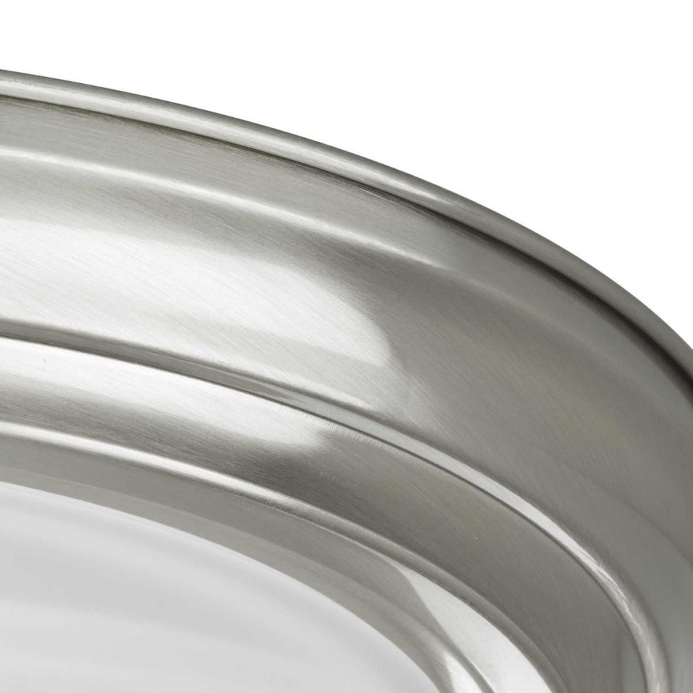 One-light 11" flush mount with dome shaped etched glass, solid trim and decorative knobs. Center lock-up with matching finial. Brushed Nickel finish.