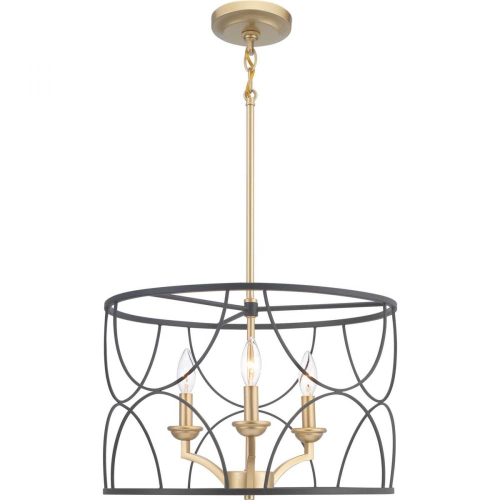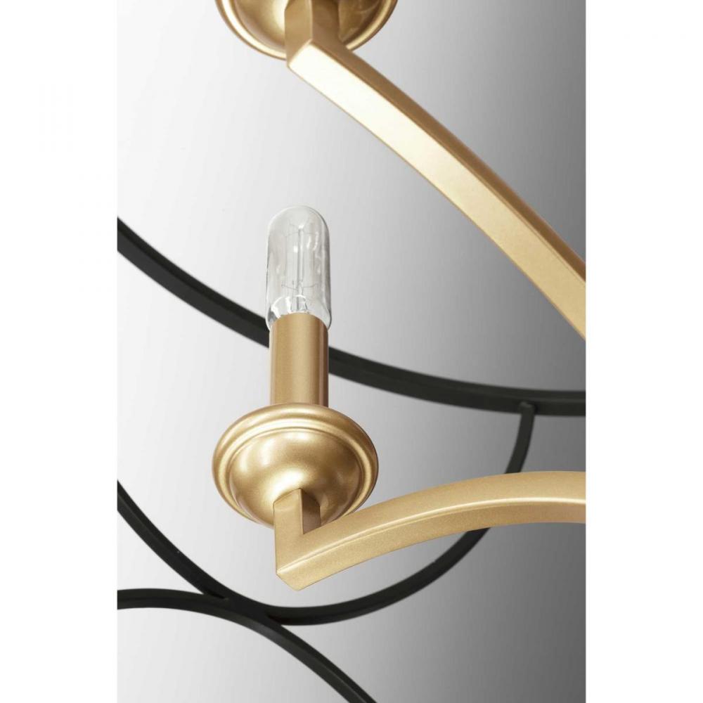 A three-light inner cluster in Vintage Gold appears to float inside a Black geometric outer cage in this Landree Collection chandelier. The frame is designed to dramatically surround each fixture, presenting depth, dimension and beauty. The exaggerated scale and elegant accents are suitable for Modern and Luxury design styles.