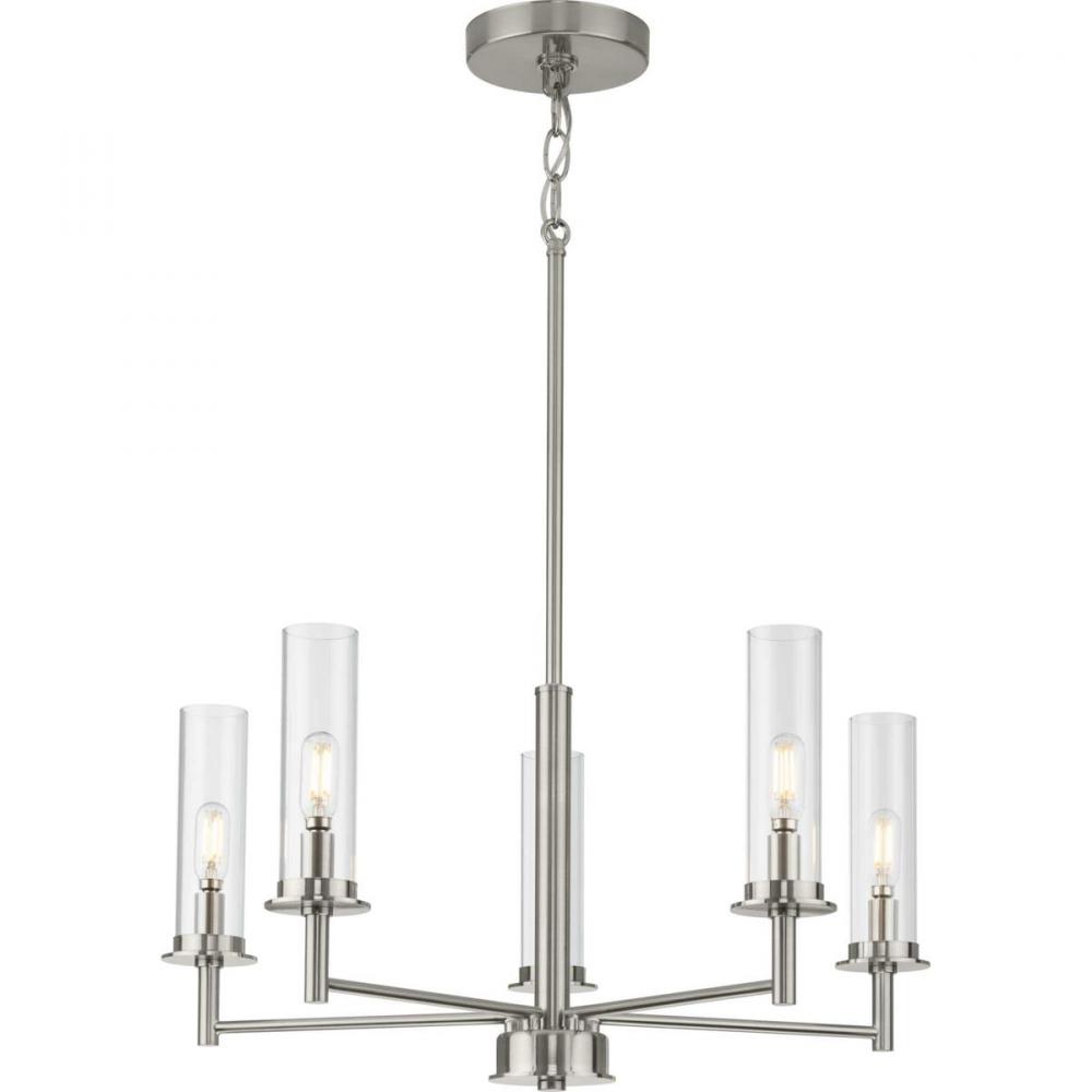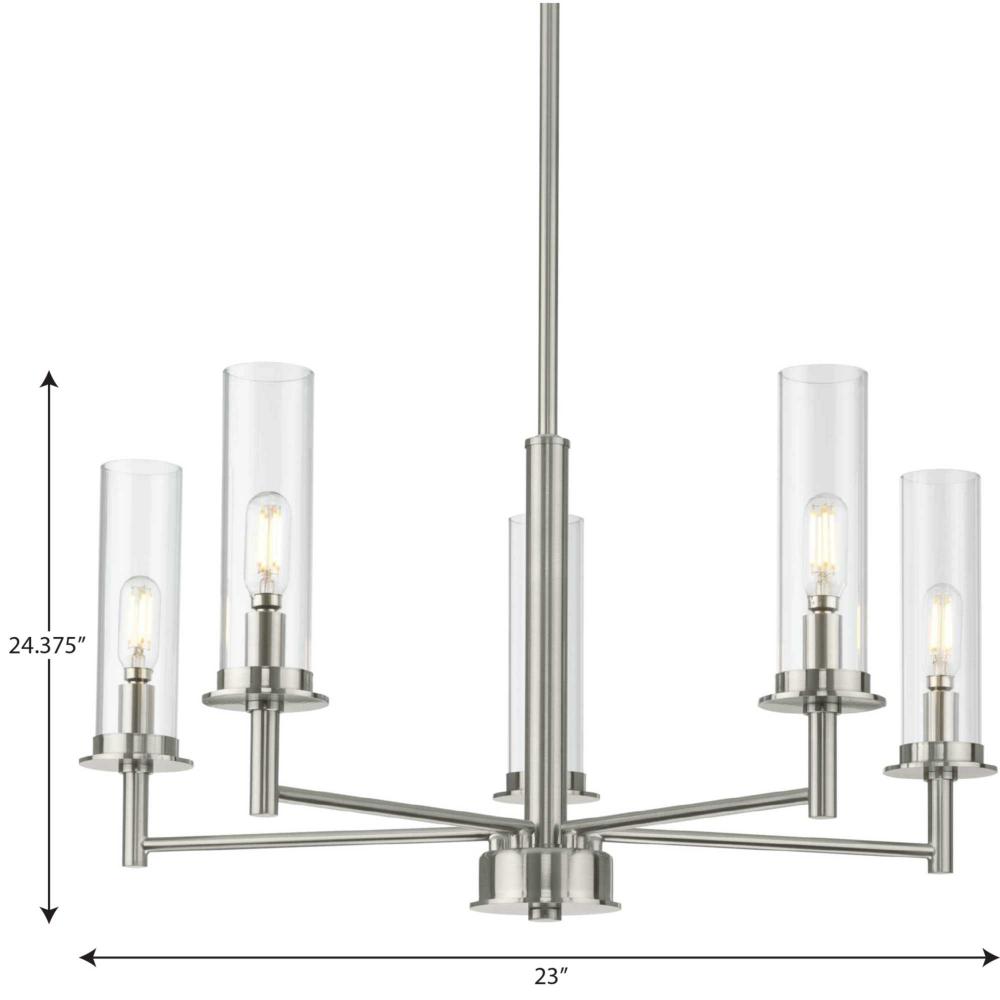 Balance the best of modern and traditional with the Kellwyn Collection 5-Light Brushed Nickel Clear Glass Transitional Chandelier Light. The classic frame with crisp, clean lines is coated in a beautiful brushed nickel finish. Light sources glow from inside cylindrical glass shades that add a touch of luxury to the design.