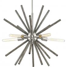Fall in love with the starburst form reinvented by a rustic twist with the Thorpe Collection 5-Light Satin Brass Mid-Century Modern Chandelier Light. Angular lines coated in a faux Hickory finish are accented by a golden satin brass center and smooth stem. Light sources extend from the center in a circular fashion for a softer, playful ambiance.