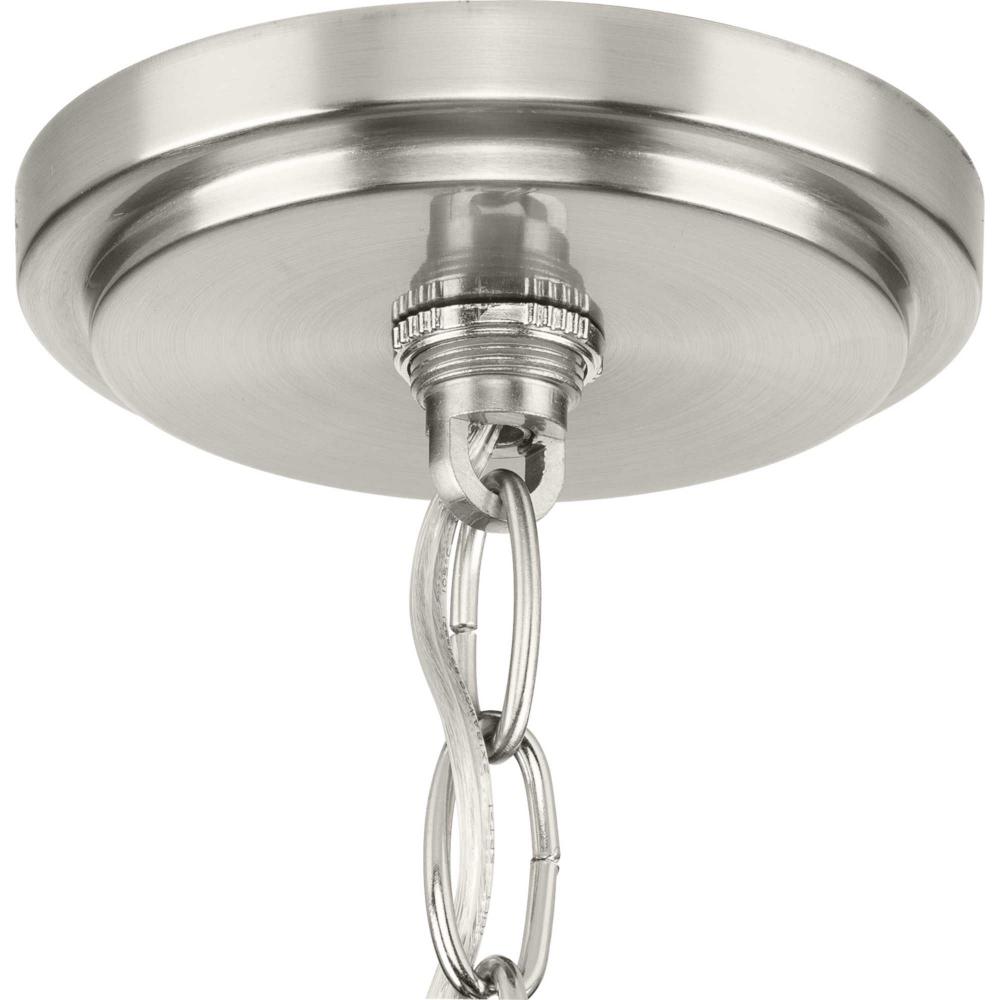 The fixture is coated with a subtle brushed nickel finish, accenting contemporary settings with a classic touch