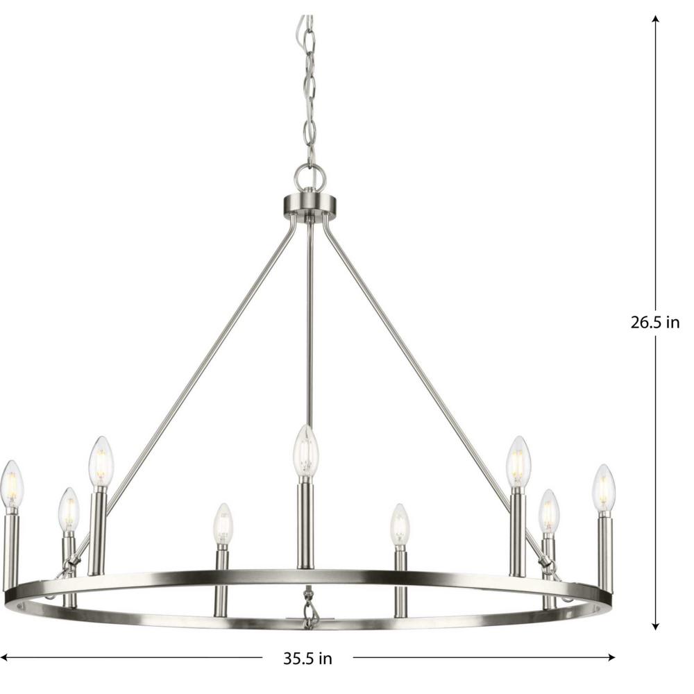 Uses (9) 60-Watt maximum candelabra base bulbs, or LED equivalent, that is sold separately, dimmable when used in conjunction with a dimmable bulb