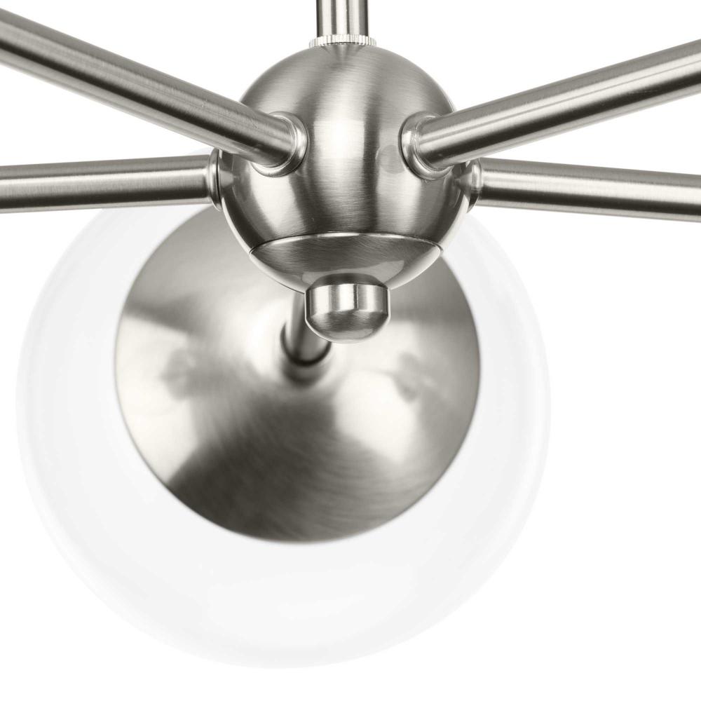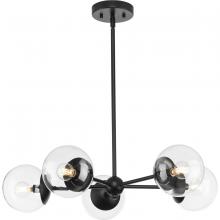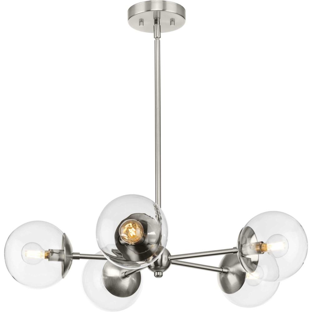 Long lines ending in clear glass globe shades define the modern aesthetic of the Atwell Chandelier. One central stem is capped by clear glass, creating bright illumination from the light source glowing within. Atwell fits beautifully into mid-century modern and contemporary settings, delivering ambient illumination to foyers, dining rooms and living rooms.