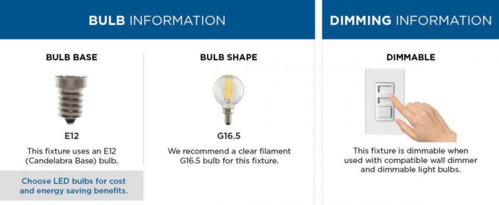 Uses (5) 60-Watt maximum candelabra (G 16.5) base bulbs, or LED equivalent, that are sold separately, dimmable when used in conjunction with a dimmable bulb
