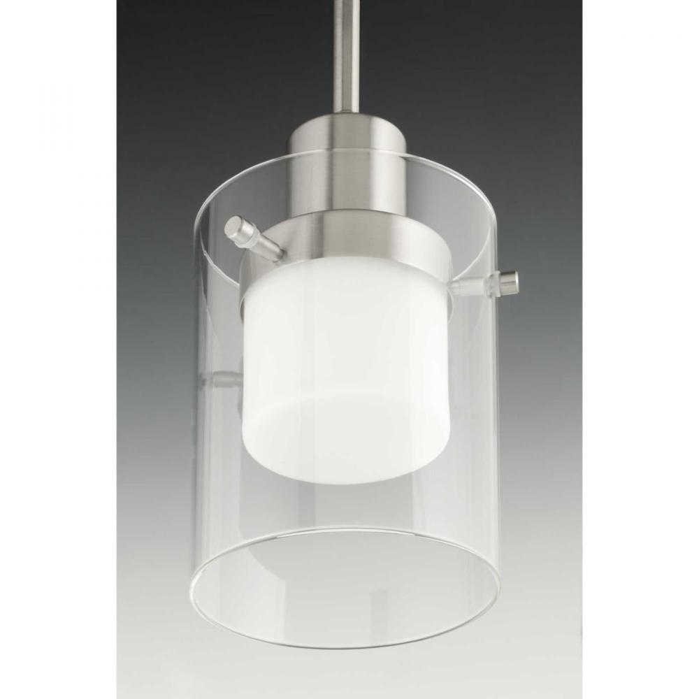 Moderna's modern-inspired silhouette provides a signature focal point for a variety of interior spaces. Features clear outer glass with an inner etched white glass shade and a sleek linear frame finished in Brushed Nickel. The one-light pendant has an AC LED module that delivers energy-efficient illumination and long life performance.