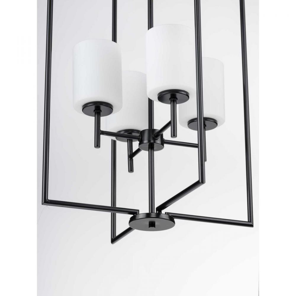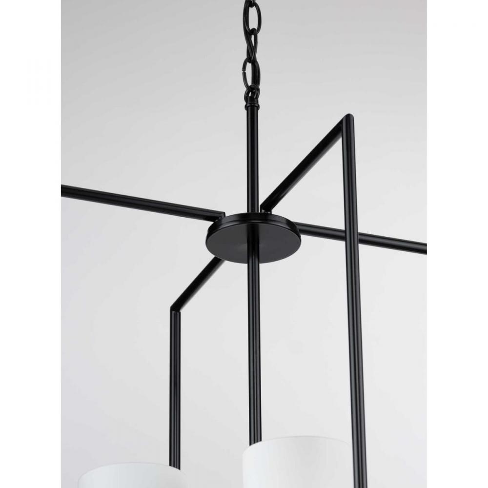 Welcome guests with elegance and class as the Reply four-light pendant washes its soft glow over a foyer, dining table, or large kitchen island. The timeless, rectangular silhouette with a statement-making Black finish extends above and below the white, etched glass shades assembled at the fixture’s center, making it an excellent piece for transitional and modern settings.
