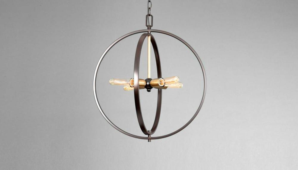 The four-light sphere medium pendant within the Swing Collection features mixed metal accents in an Antique Bronze finish with Vintage Brass candle holders. The vintage undertones adds style to dining rooms and kitchens.
