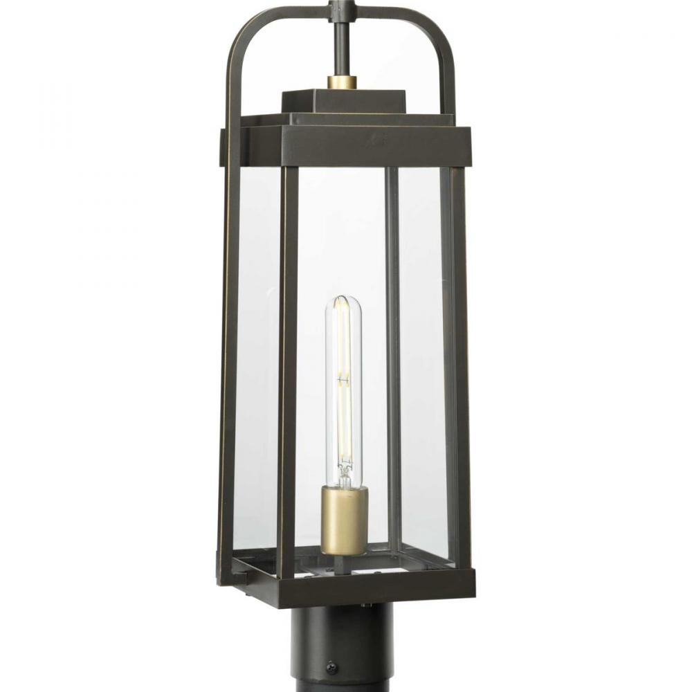 Combine a stately elegance with modern style with the Walcott Collection. The post lantern's elongated frame holds clear glass panels. The frame is coated in a handsome antique bronze finish punctuated with brass-tone accents to add vintage charm.