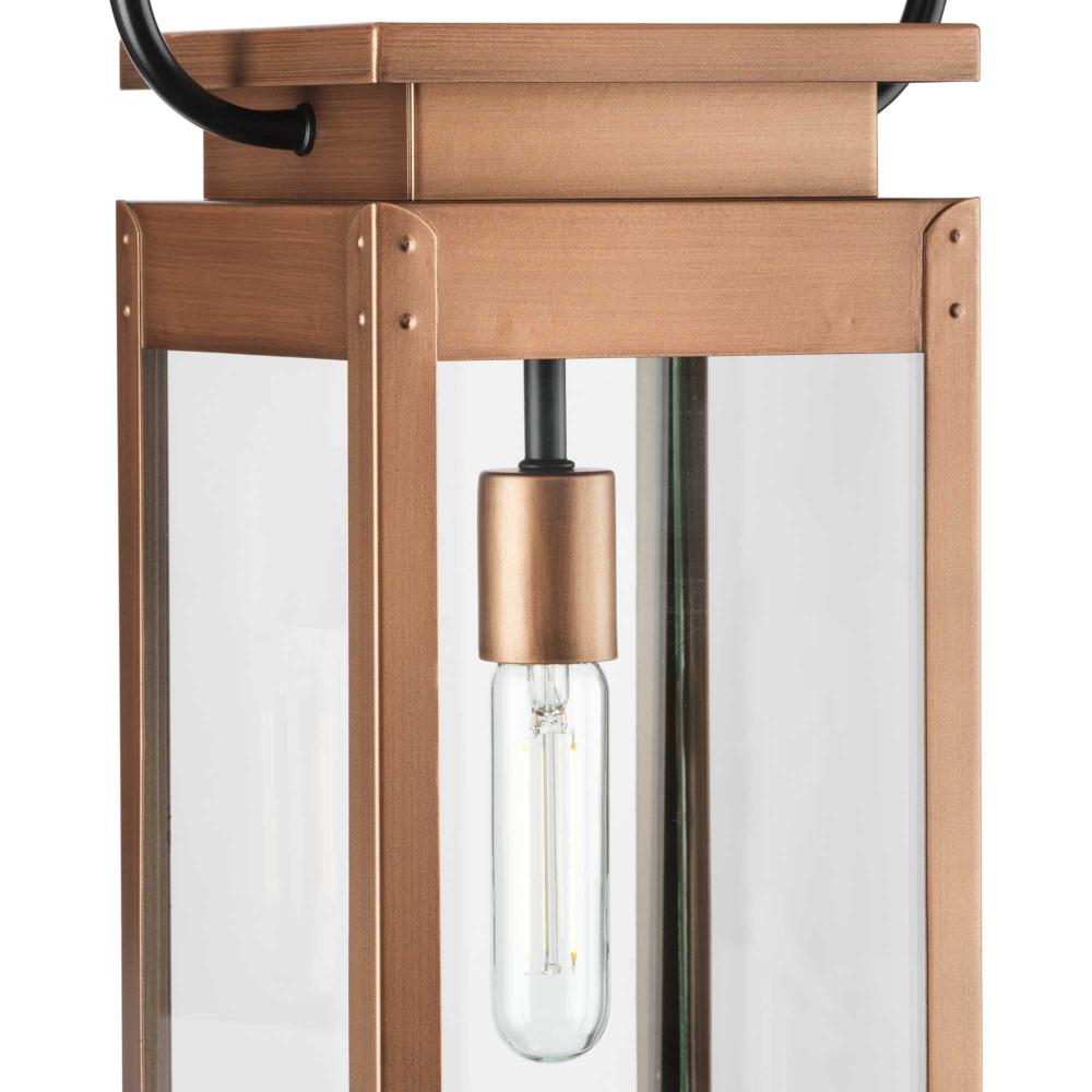 Taking its inspiration from vintage gas lanterns, Union Square has a timeless Antique Copper finish that graciously complements its clear flat glass panels. Mechanical details provide character to the form. This fixture is part of the Progress Lighting Design Series, a lighting collection offering fashionable styles and affordable luxury lighting for the home.
