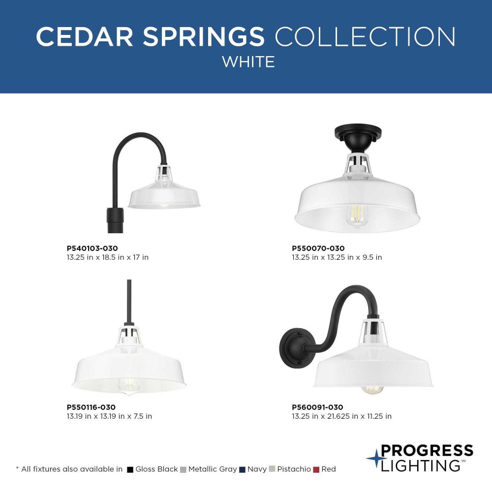 Enjoy a fun take on the traditional warehouse shade with a pendant light from the Cedar Springs Collection. The generous shade is coated in a gloss white finish. A smooth black stem holds the ceiling light in place. This classic light fixture will upgrade any farmhouse or transitional style setting. Dark Sky Friendly.