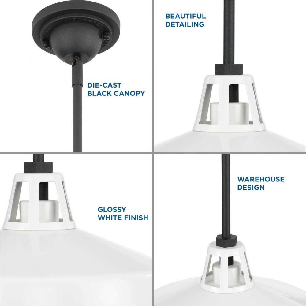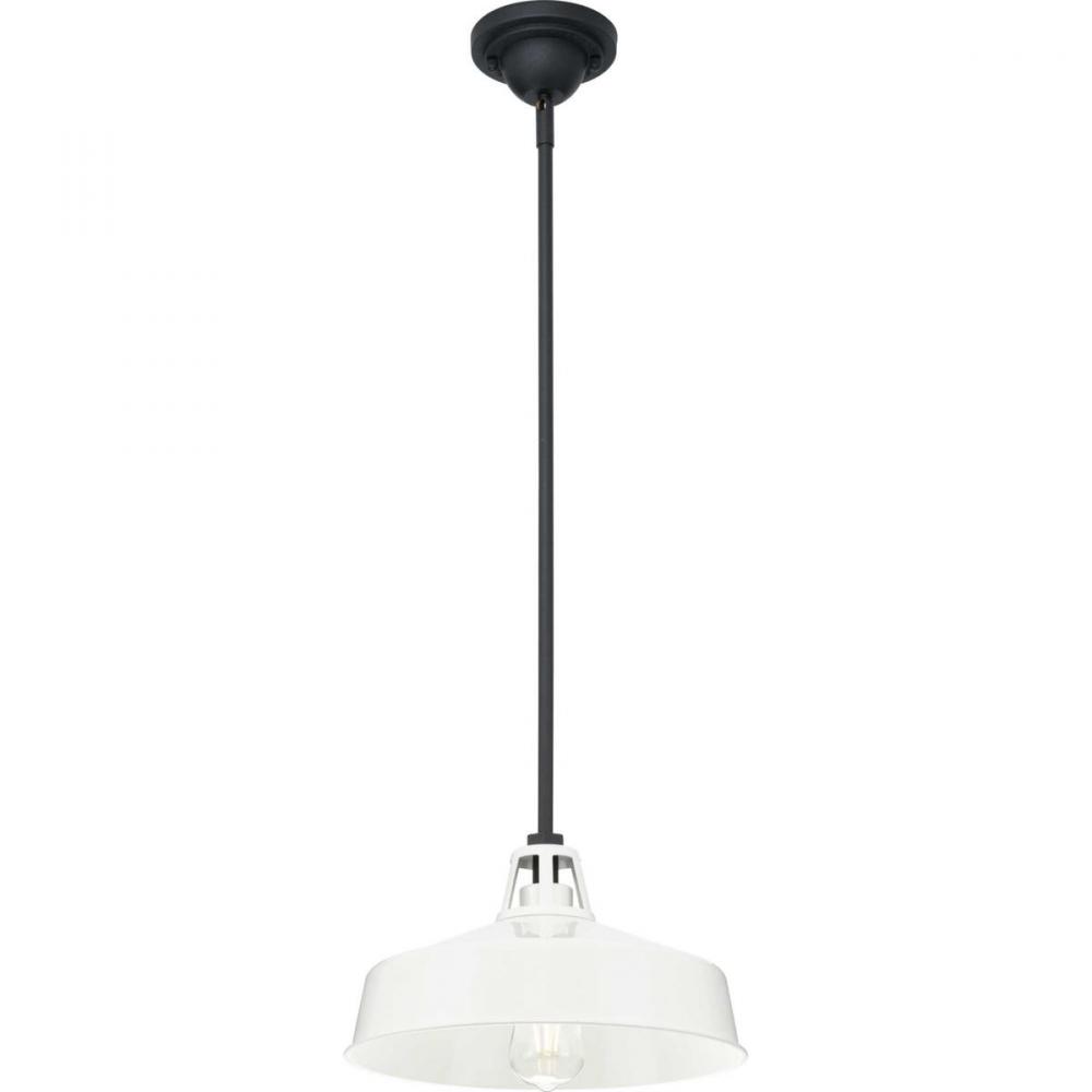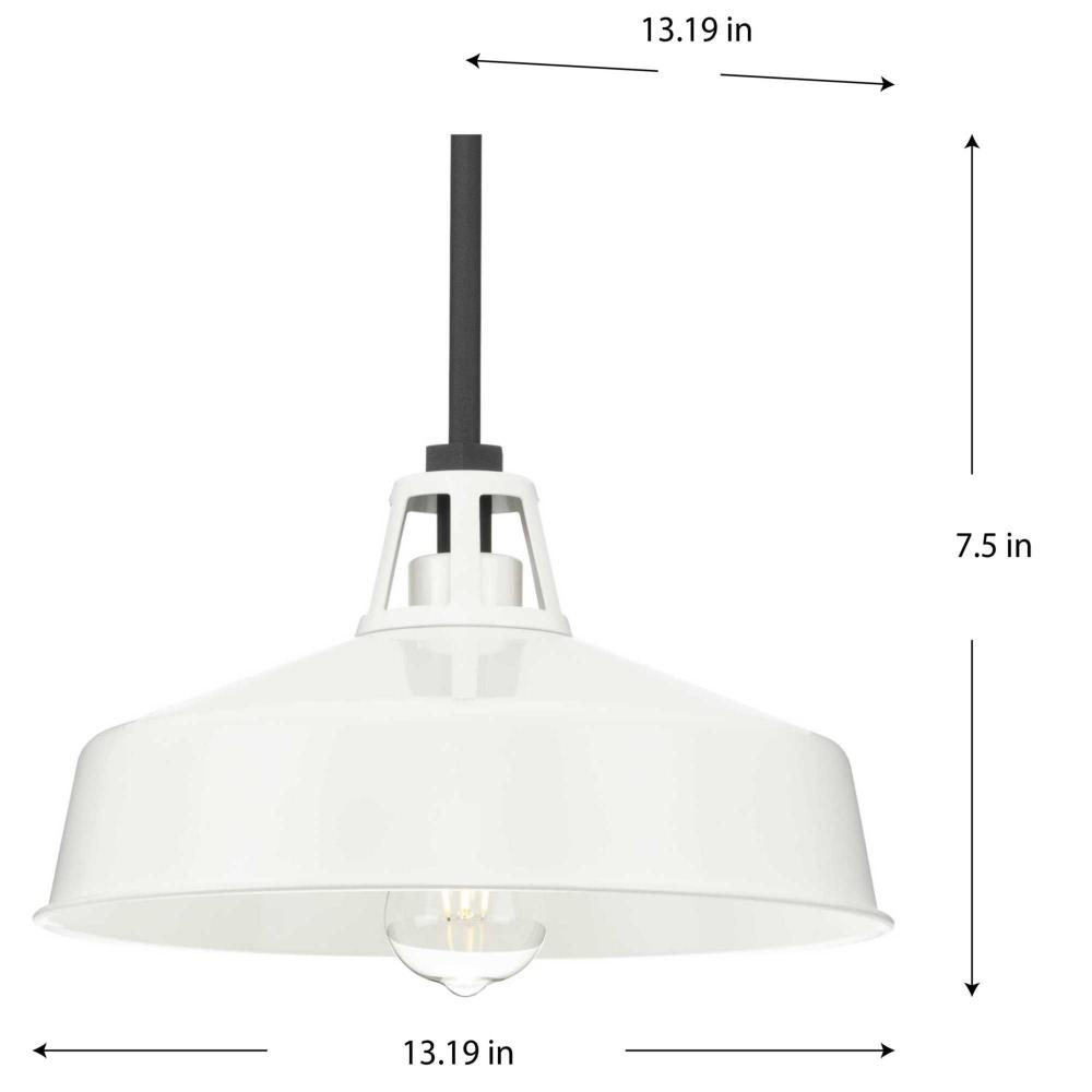 Ideal for a patio, kitchen, or porch;Perfect for farmhouse, urban industrial, and coastal style settings;Crisp white finish with textured black accents;White metal shade;Includes one 6-inch stem and four 12-inch stems to adjust for a variety of ceiling hei