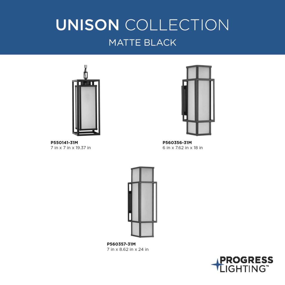 Crisp lines and sharp angles define the sleek silhouette of the Unison Collection. Interconnected rectangles finished in crisp matte black holds etched, seeded glass diffusers that deliver a mellow glow. This elegant hanging lantern makes a grand statement at a front entrance, over islands and tables in outdoor entertaining areas or inside in various rooms in contemporary, modern craftsman and modern farmhouse homes. Customize the hanging height with the included 72 in. of chain for a variety of ceiling heights and can be used on a sloped ceilings. It is cULus damp location listed for use where water may be present, with a one-year warranty to guarantee your complete satisfaction. Progress Lighting products are designed for exceptional quality, reliability, and functionality.