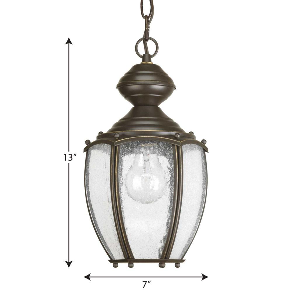 Solid one-light 7" hanging lantern in rich weathered finish is complemented by seeded glass panels - a great choice for low maintenance and years of enjoyment. Chain and ceiling mounts included. Antique Bronze finish.