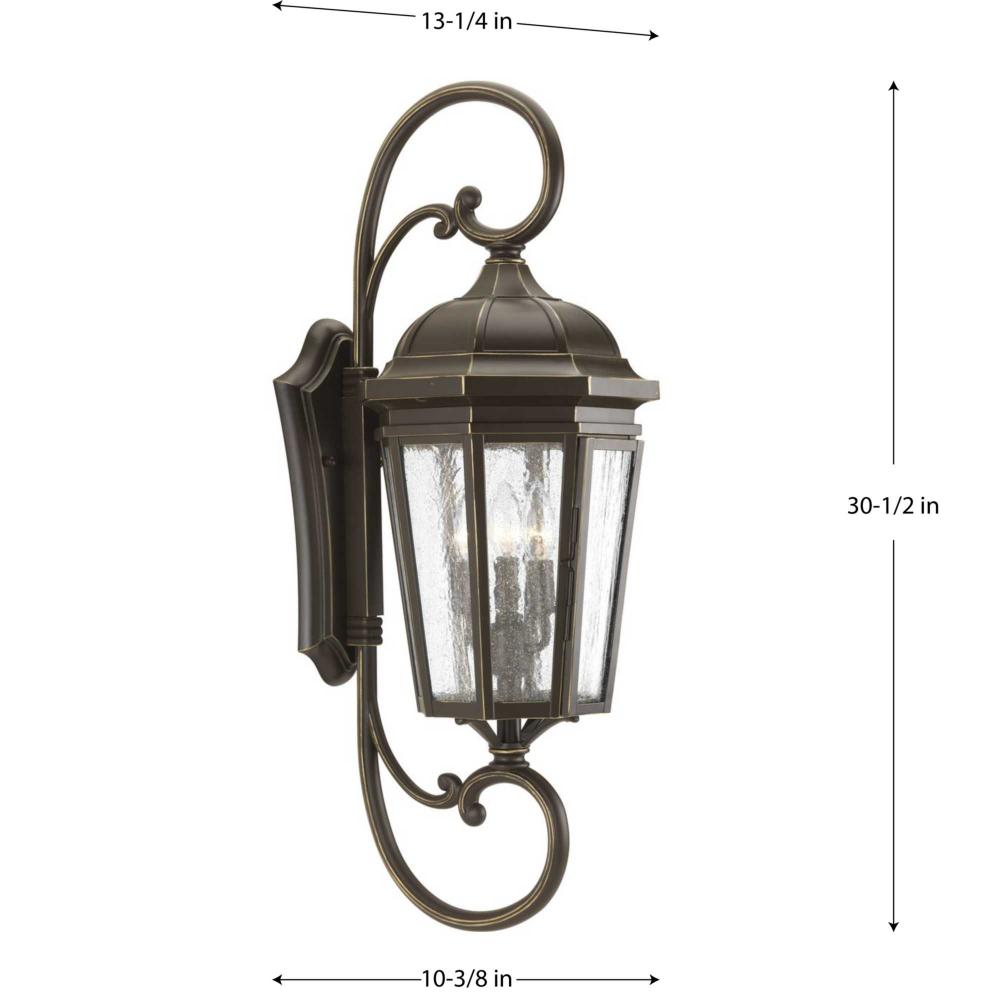 The three-light wall lantern in the Verdae collection offers traditional styling for a variety of exteriors. Classic and formal clear seeded glass complements an Antique Bronze finish. Hinged door for easy access to replace lamps.