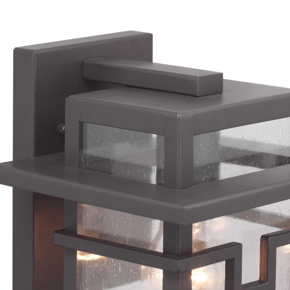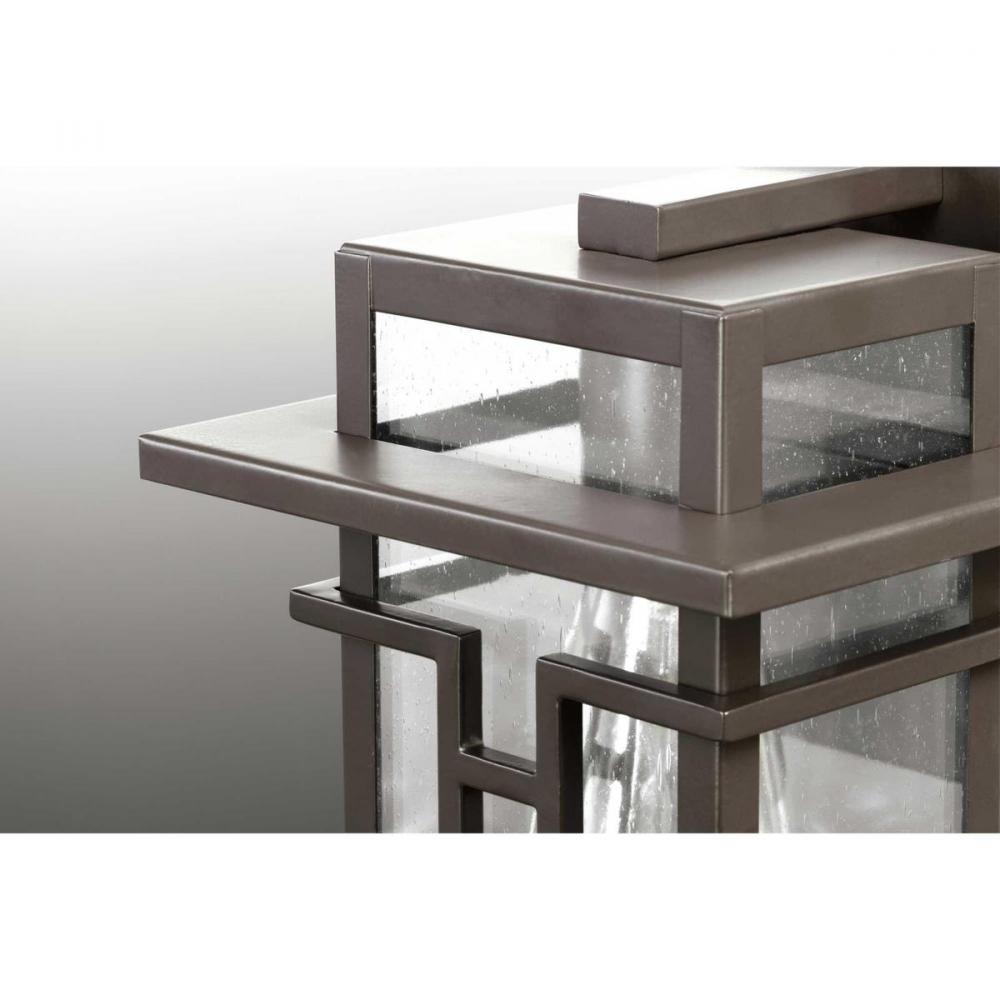 Geometric details in Boxwood’s design enhance Craftsman-inspired architecture. The one-light medium wall lantern features clear seeded glass and finished in Antique Bronze which completes the authentic style.