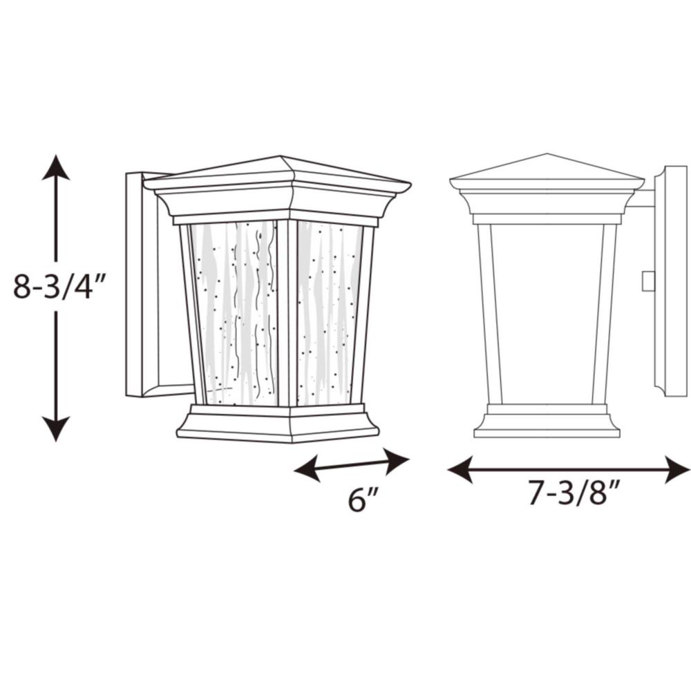 Arrive LED lanterns feature a die-cast aluminum, powder coated frame and heavily textured glass. One-light small wall lantern. 90+ CRI, 3000K, 623 lumens (source). Energy Star.