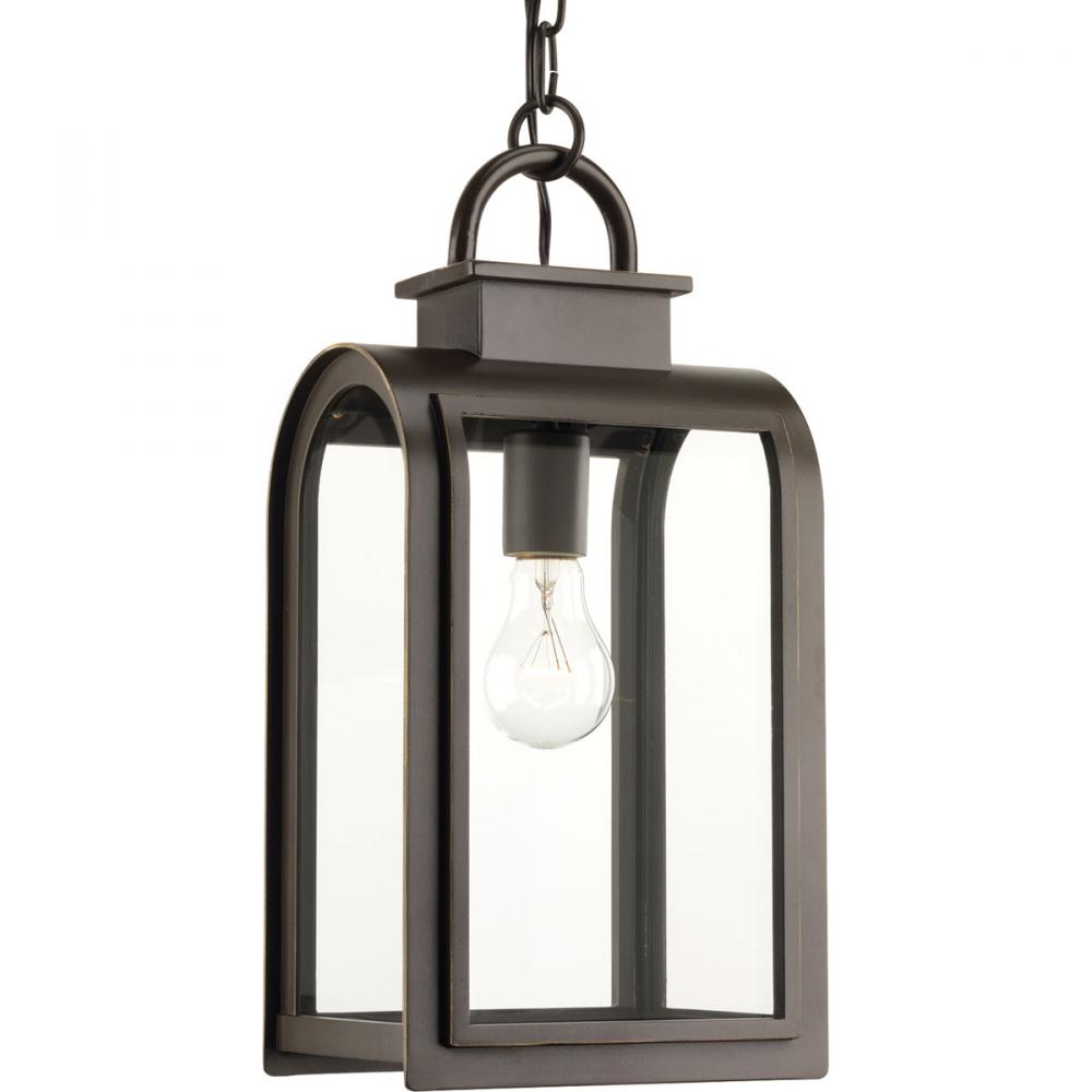 One-light hanging lantern in a Cape Cod-inspired frame pays homage to a classic nautical style. Light output and geometric forms offer visual interest to outdoor exteriors. Clear glass windows provides a beautiful effect when illuminated.