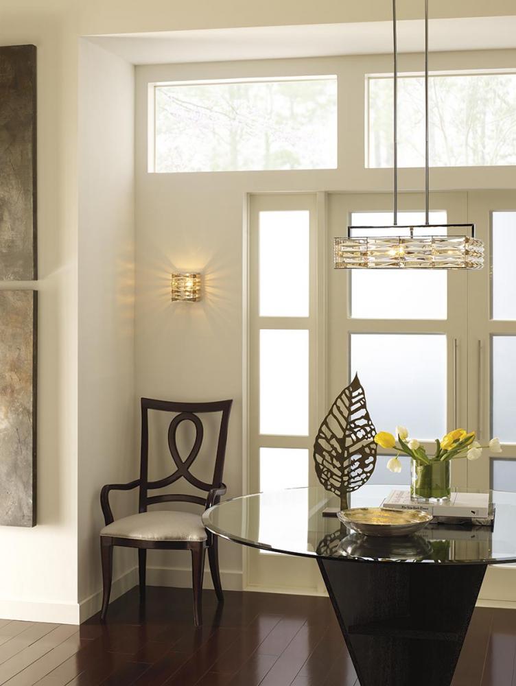 With alternating clear and champagne tinted K9 glass accents, The Pointe celebrates the element of sparkle through a sophisticated and glamorous design. A variety of fixtures can be intermingled within the same environment for a creatively modern and elegant effect. Five-light Square Pendant.