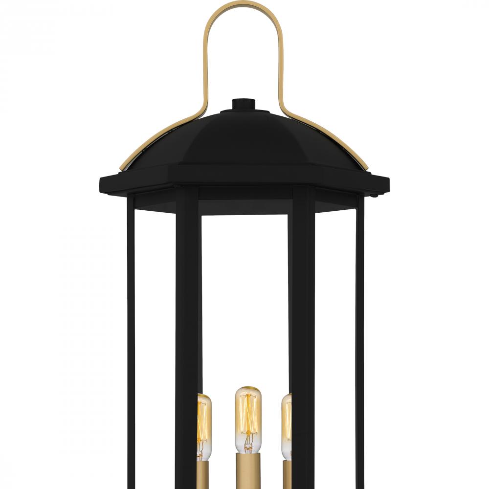 Illuminate your homes exterior with the timeless style of Crestfield lanterns. The elongated frame is finished in matte black and accented beautifully with brushed gold for a hint of luster and sophistication. Clear tempered glass panels complete the look