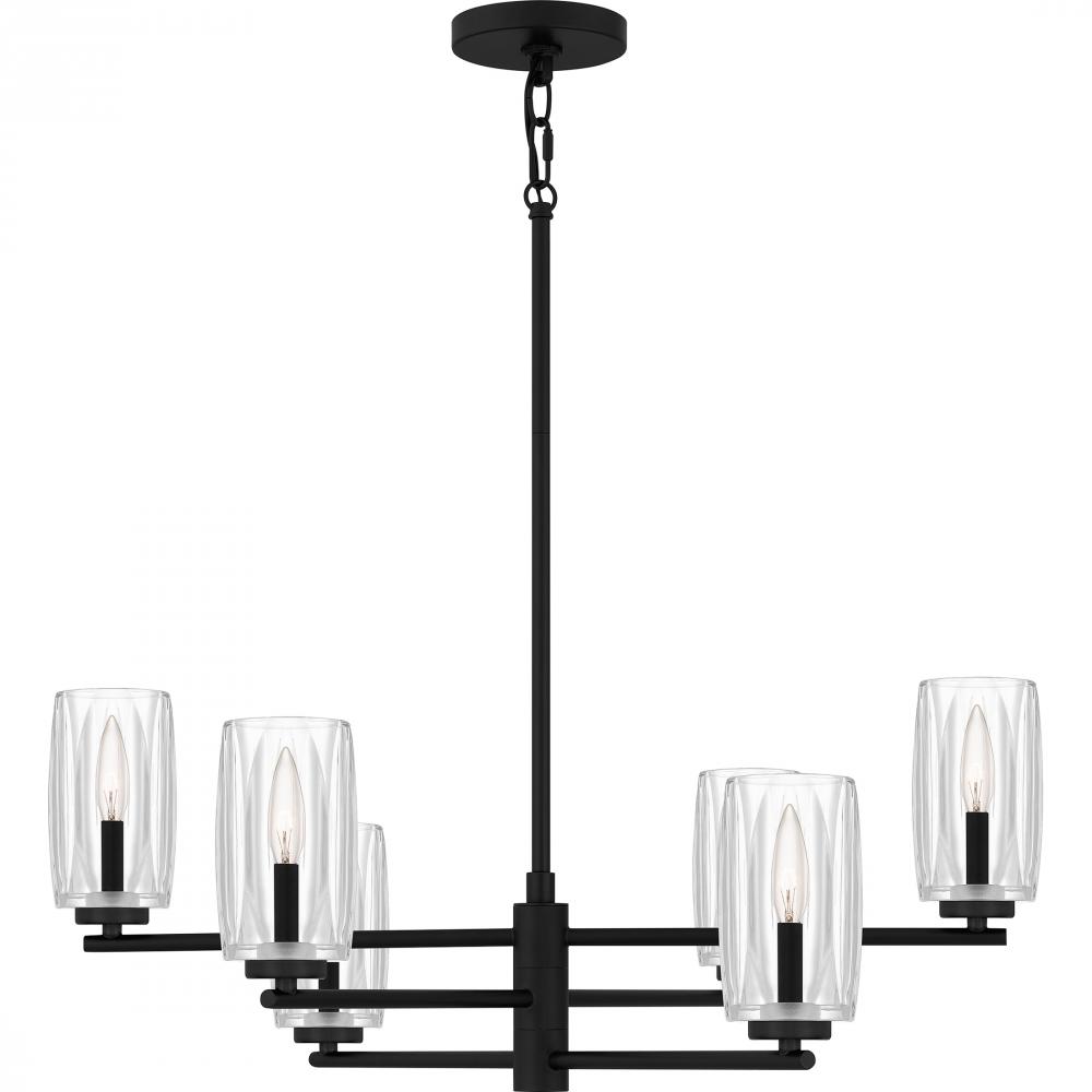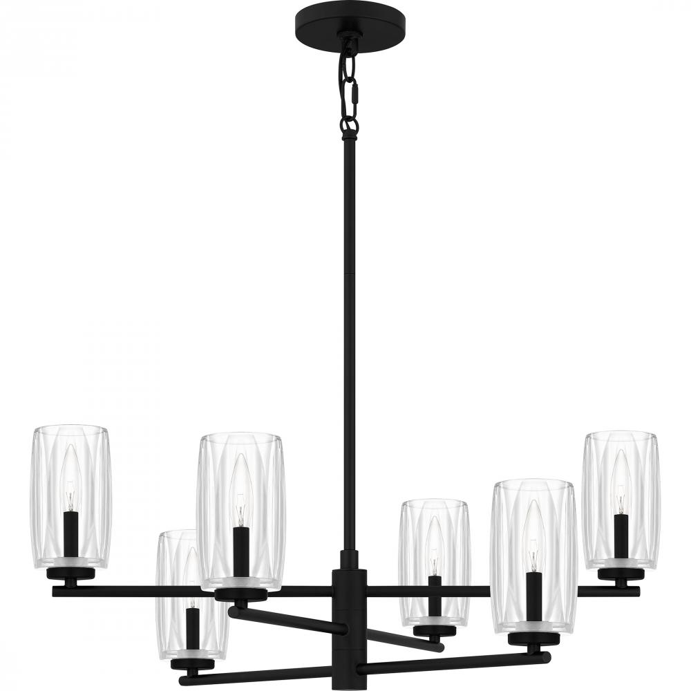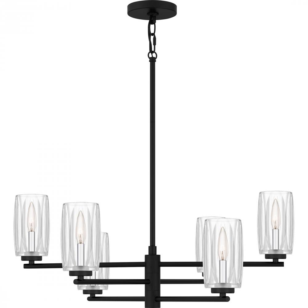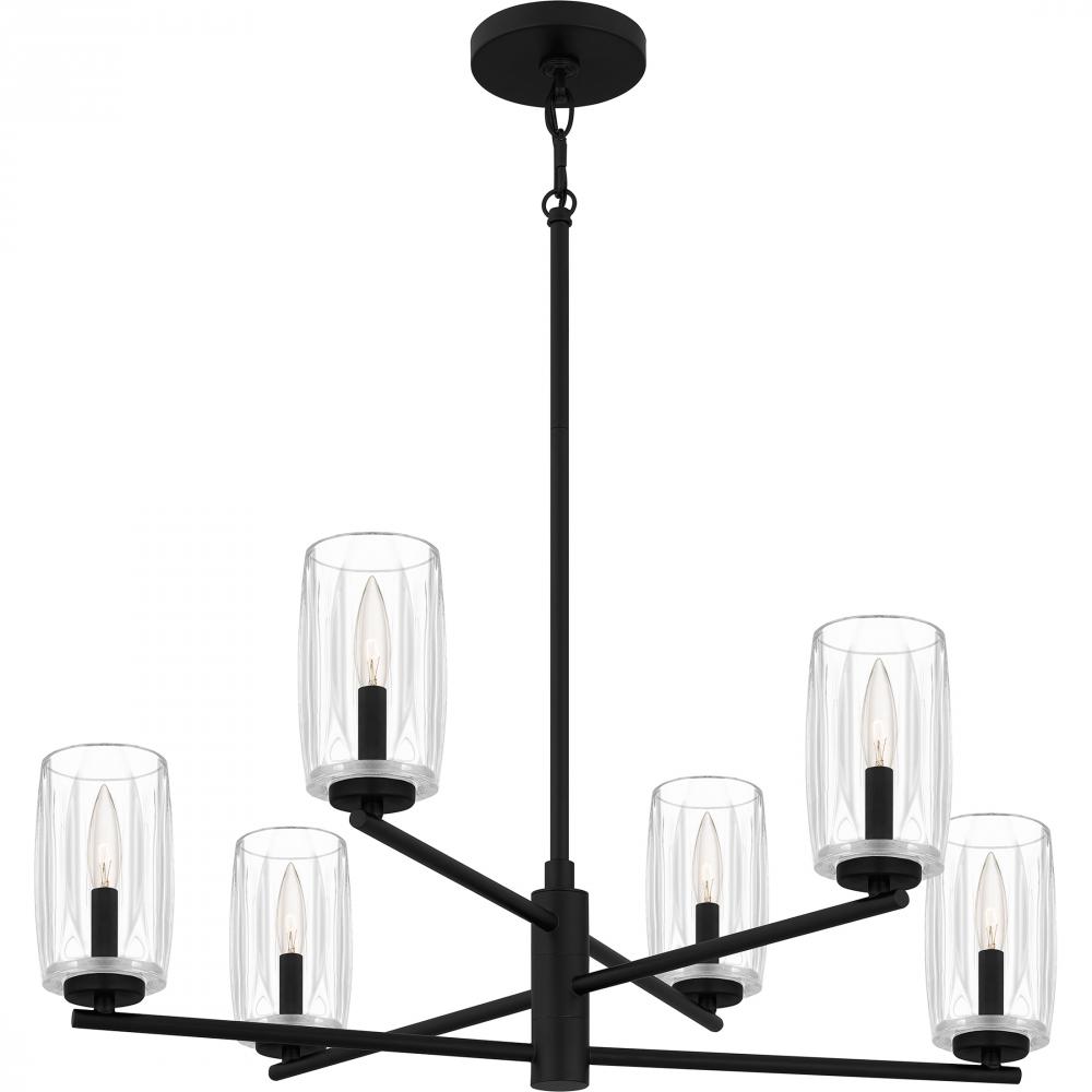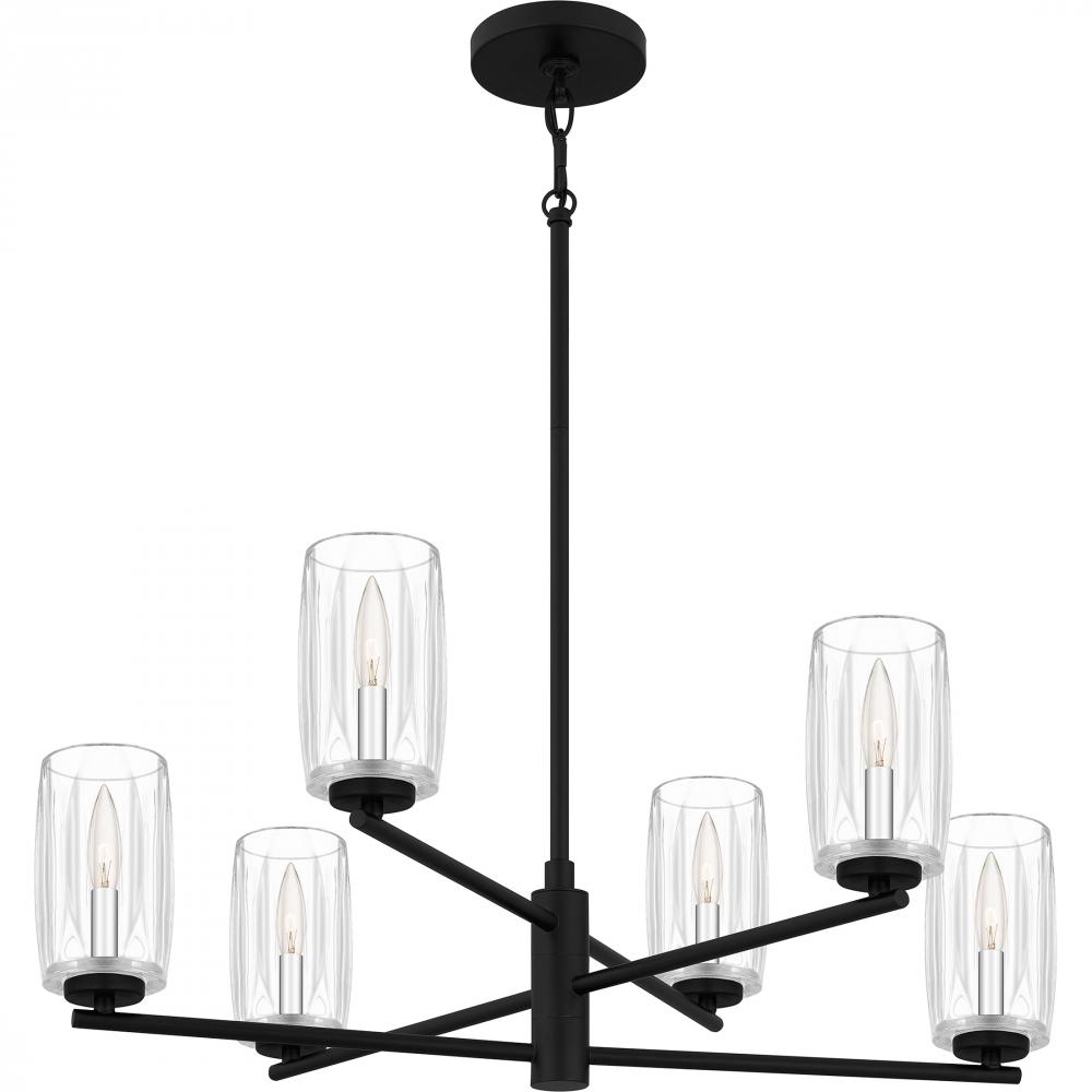 Matte black and clear crystal cut glass create a classic, elegant pairing. Whether above a dining room table or in a living room, the Cunningham chandelier adds a hint of glam in any setting. Candle covers are provided in two finishes, matte black and chro