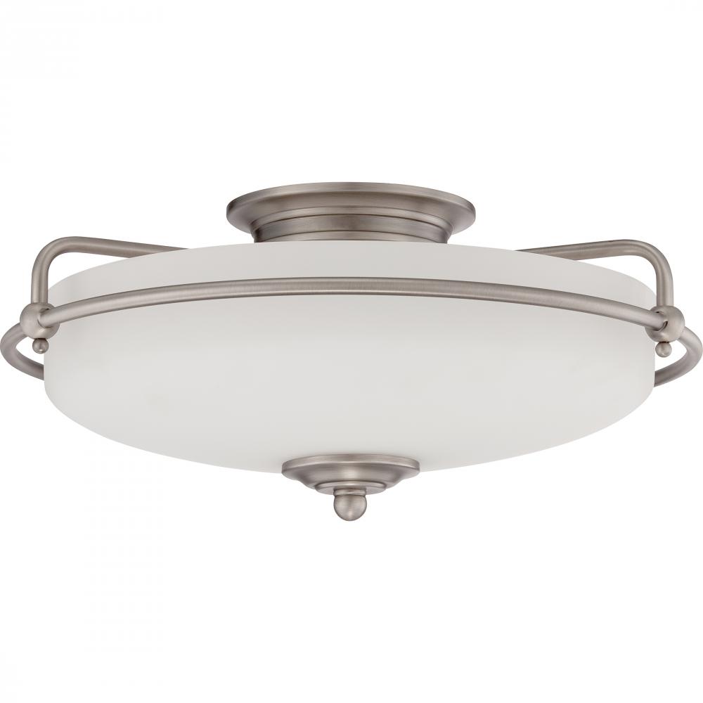 This understated style provides a stylish soft modern look for most any room. The etched shade is painted white inside diffusing the light evenly and illuminating your home with a soothing glow. It is held in place by softly curved arms and is availabl
