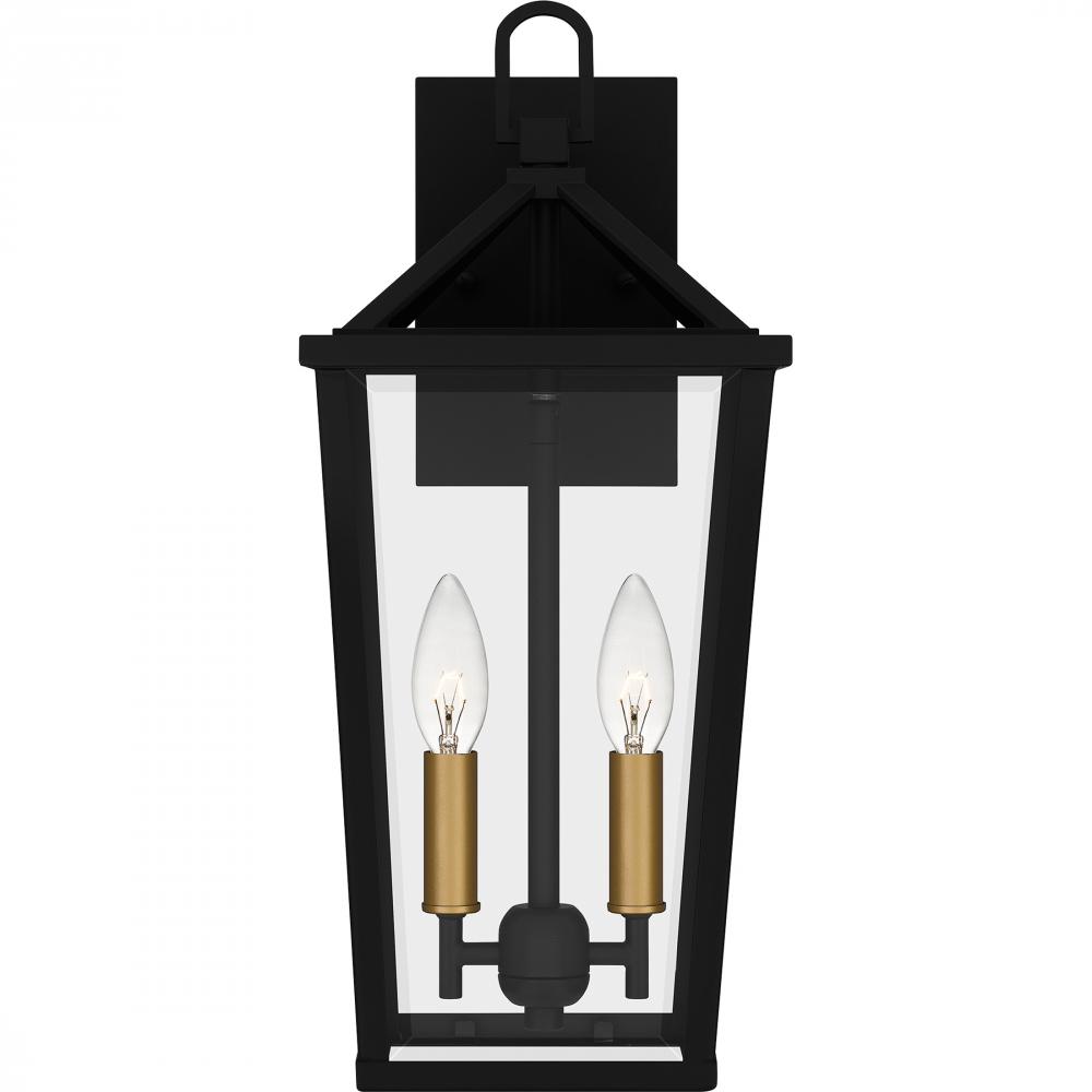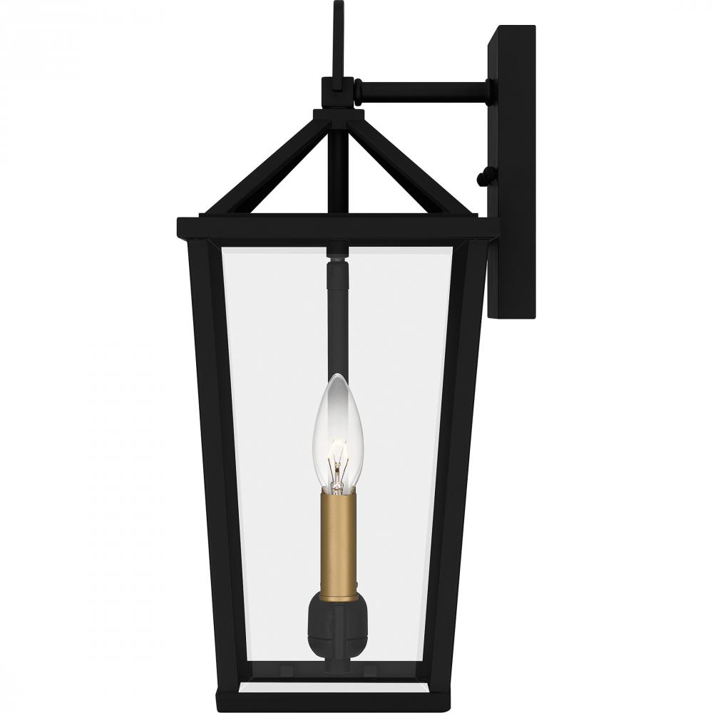 Hull is a traditional outdoor lantern collection designed for sleek exteriors. The tapered frame is finished in matte black and accented beautifully with gold candle sleeves for a hint of luster and industrial style. Clear beveled glass panels complete the