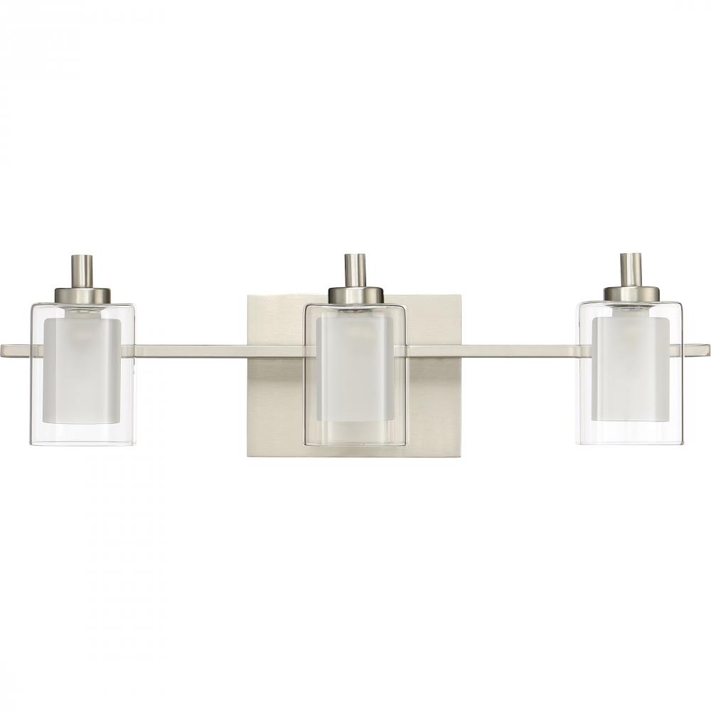 This modern posh collection features a simplistic design with a brushed nickel finish. The inner heavy glass is sand-blasted inside and encased within outer clear glass for a sophisticated and stunning look.