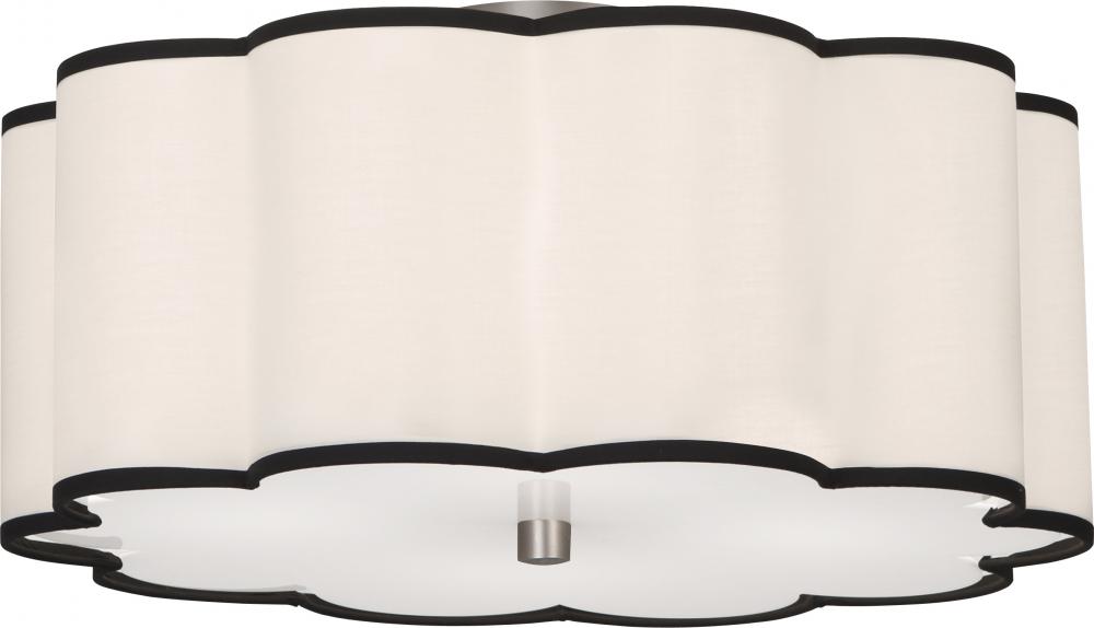 Blackened Antique Nickel Finish Axis Flushmount with Scalloped Ascot White Fabric Shade with Black Contrasting Trim - Axis features a scalloped design that diffuses the light in a most inviting way and also adds an elegant touch that is subtle and charming.