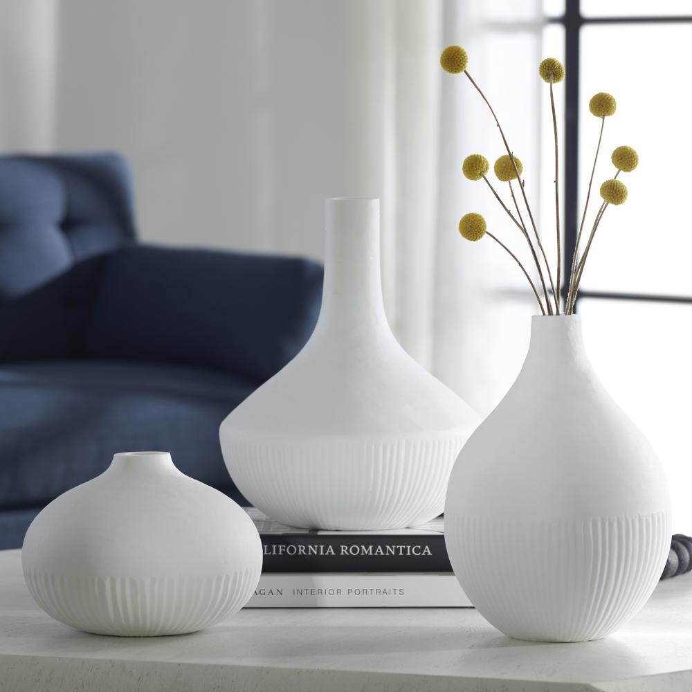 The Apothecary Vases Showcase Three Varying Curved Silhouettes Accented By Carved Details in A Satin White Finish. Sizes: S-8x6x8, M-8x11x8, L-10x12x10