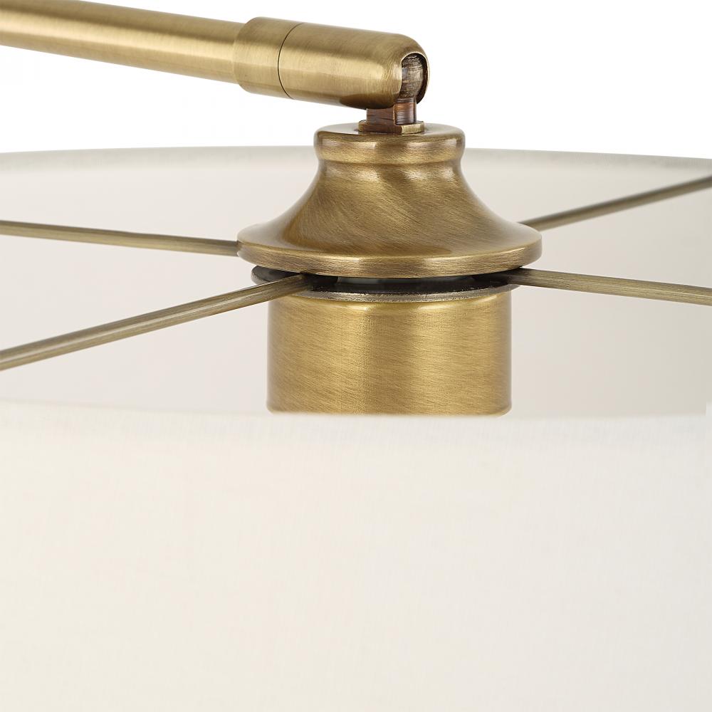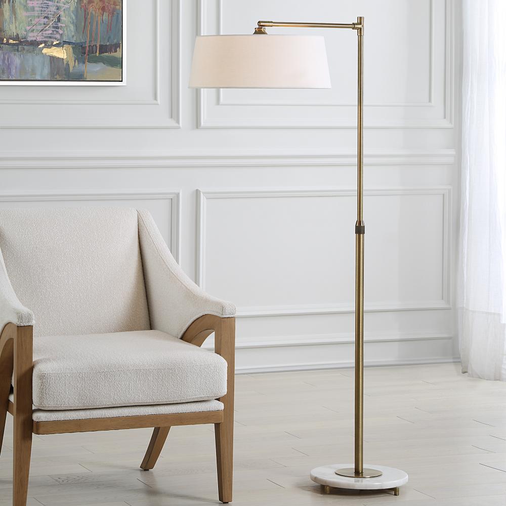 This Refined Floor Lamp Is Crafted From Iron Finished In A Plated Antique Brushed Brass, Attached To A White Marble Foot. The Branch Out Floor Lamp Features A Telescoping Neck That Allows It To Go From A 48" Tall Reading Lamp To A 67" Tall Floor Lamp. The Shallow Slightly Tapered Hardback Shade Is A White Linen Fabric, Attached To A Pivoting Stem.