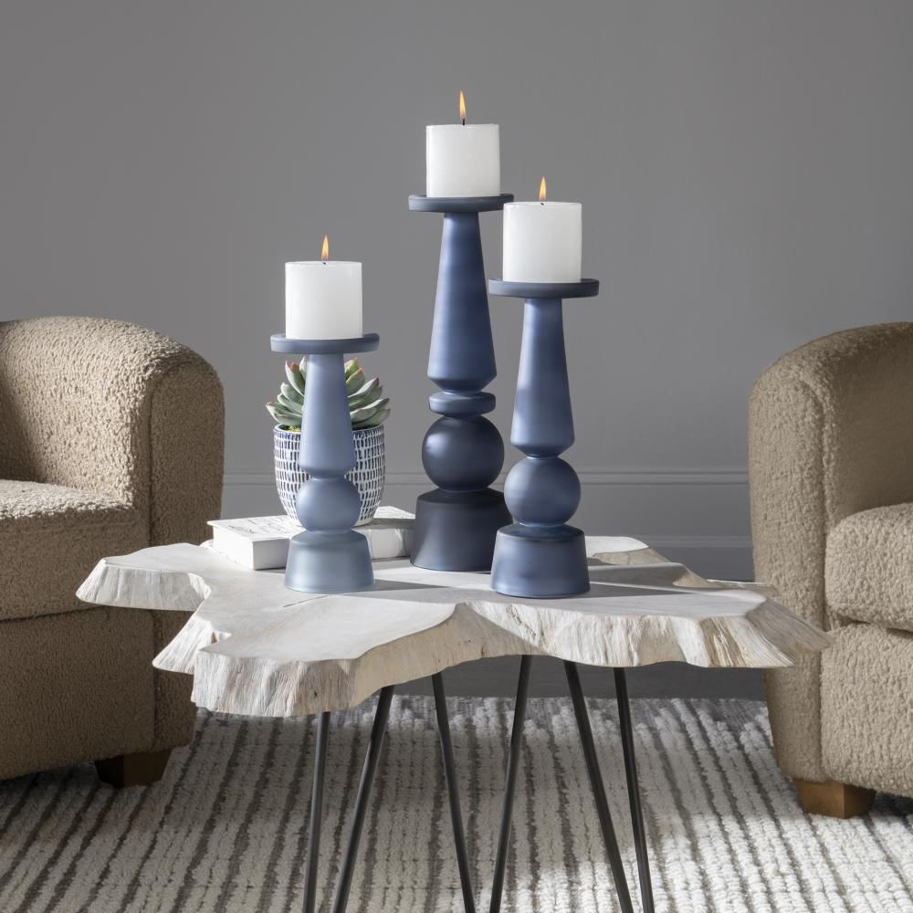 Set of Three Candleholders Showcase Traditional Silhouettes and Are Made From A Deep, Midnight Blue Glass with Three 3"x 3" White Candles Included. Sizes: S-4x10x4, M-4x12x4, L-5x15x5