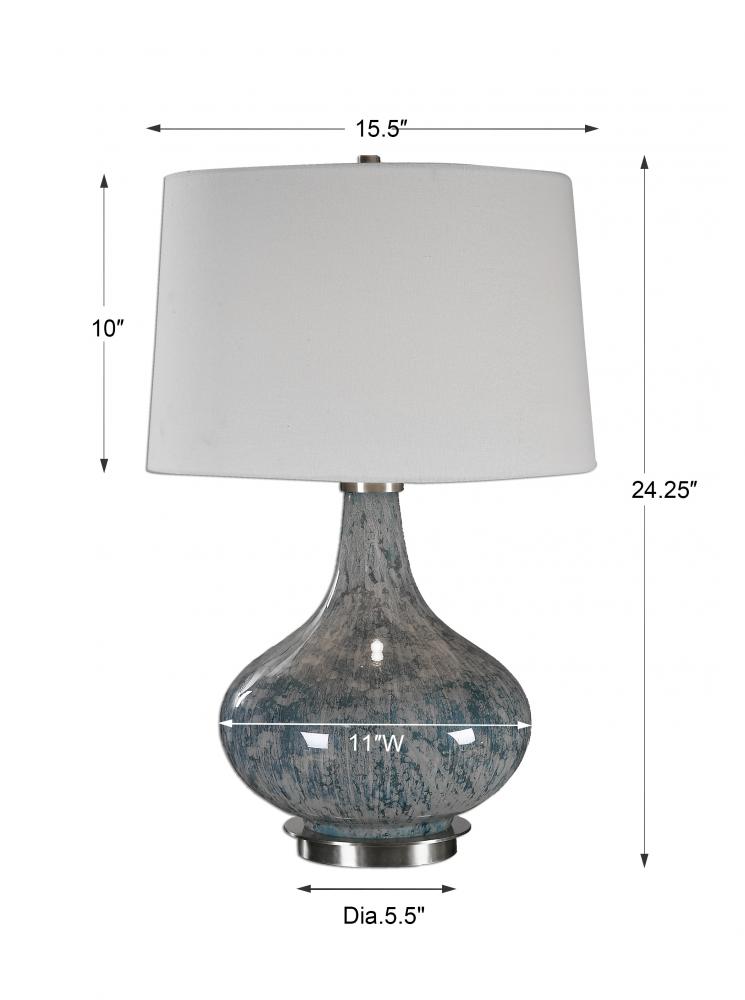 Mottled, Light Blue Gray Glass Accented with Plated Brushed Brass Details. The Slightly Tapered Round Hardback Shade is An Ivory Linen Fabric with Light Slubbing.