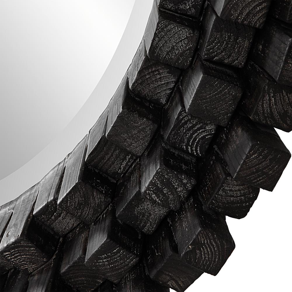 This Round Wood Mirror Has A Contemporary Rustic Flair By Featuring Angled Pillars of Solid Wood Stacked in Alternating Heights for A Dramatic and Unique Display, Finished in An Ebony Stain with A Subtle Gray Wash. Mirror Has A Generous 1 1/4" Bevel.