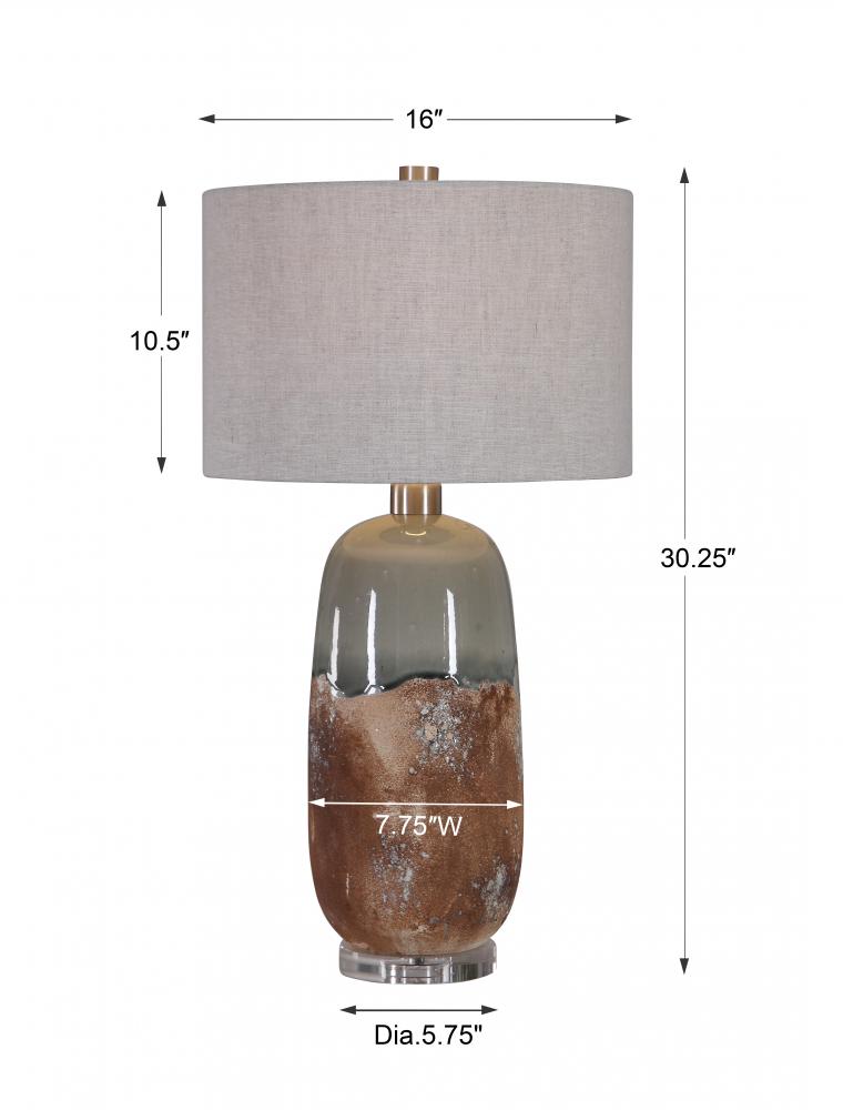 This Table Lamp Features A Ceramic Base Finished in An Earthy Terracotta Rust That Transitions Into A Crackled Green-gray Glaze, Accented with Brushed Nickel Plated Details and A Thick Crystal Foot. The Hardback Drum Shade is A Warm Gray Linen Fabric with Natural Slubbing.